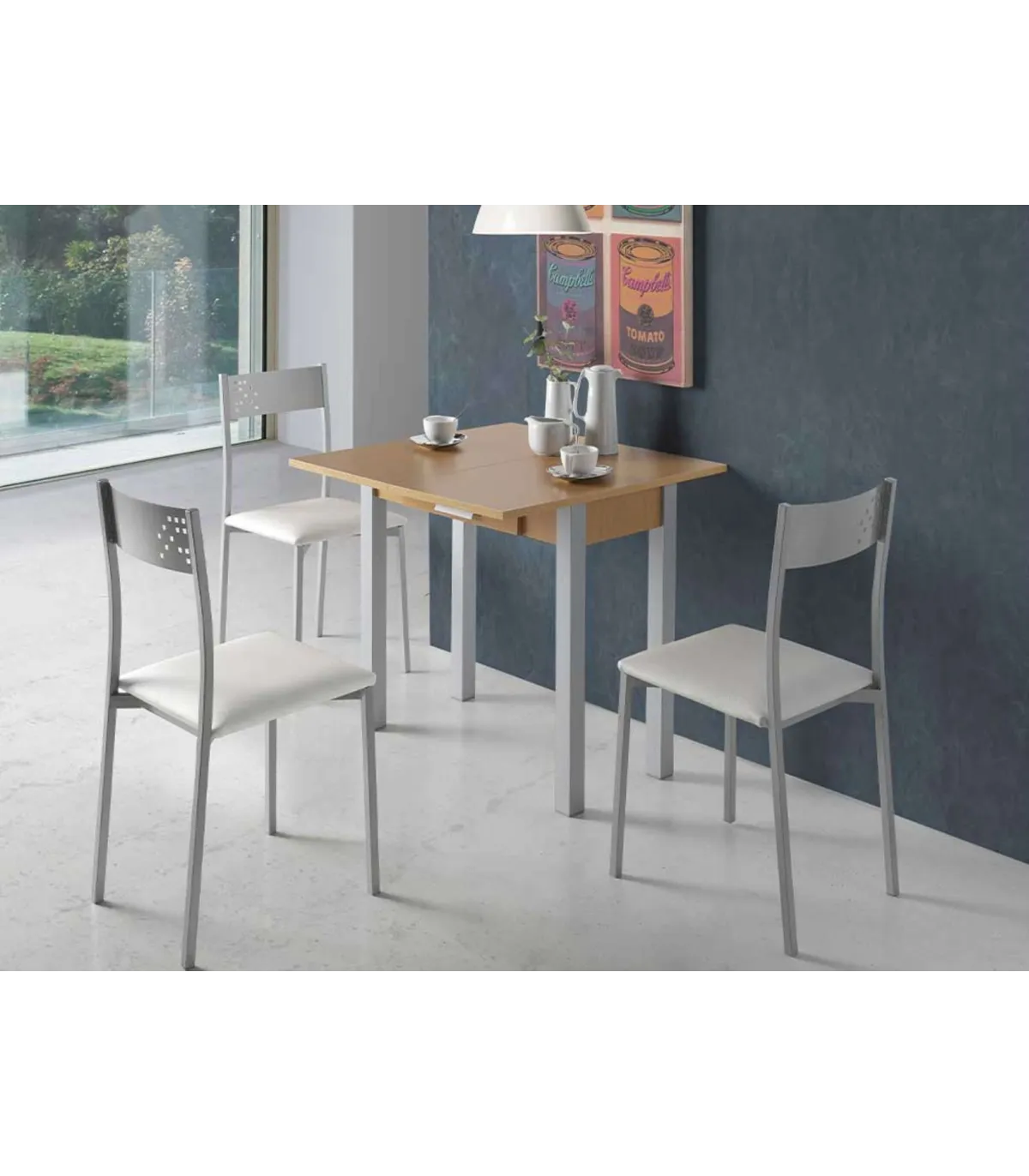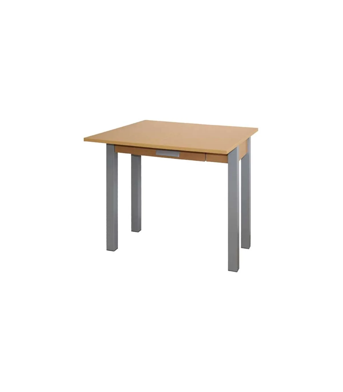 Kitchen table with book-style opening top. The structure and top are made of MDF wood laminated in various finishes. It has square legs in silver gray metal. With drawer and metal handle.