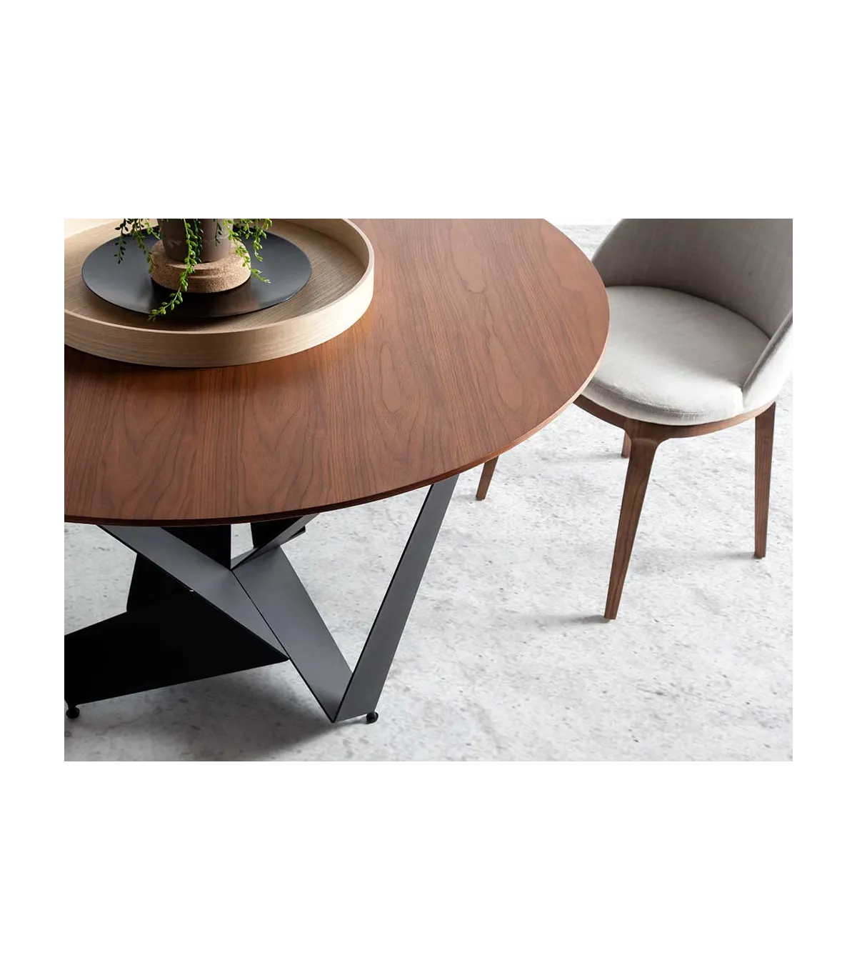 Circular fixed dining table with top in MDF with walnut veneer finish.