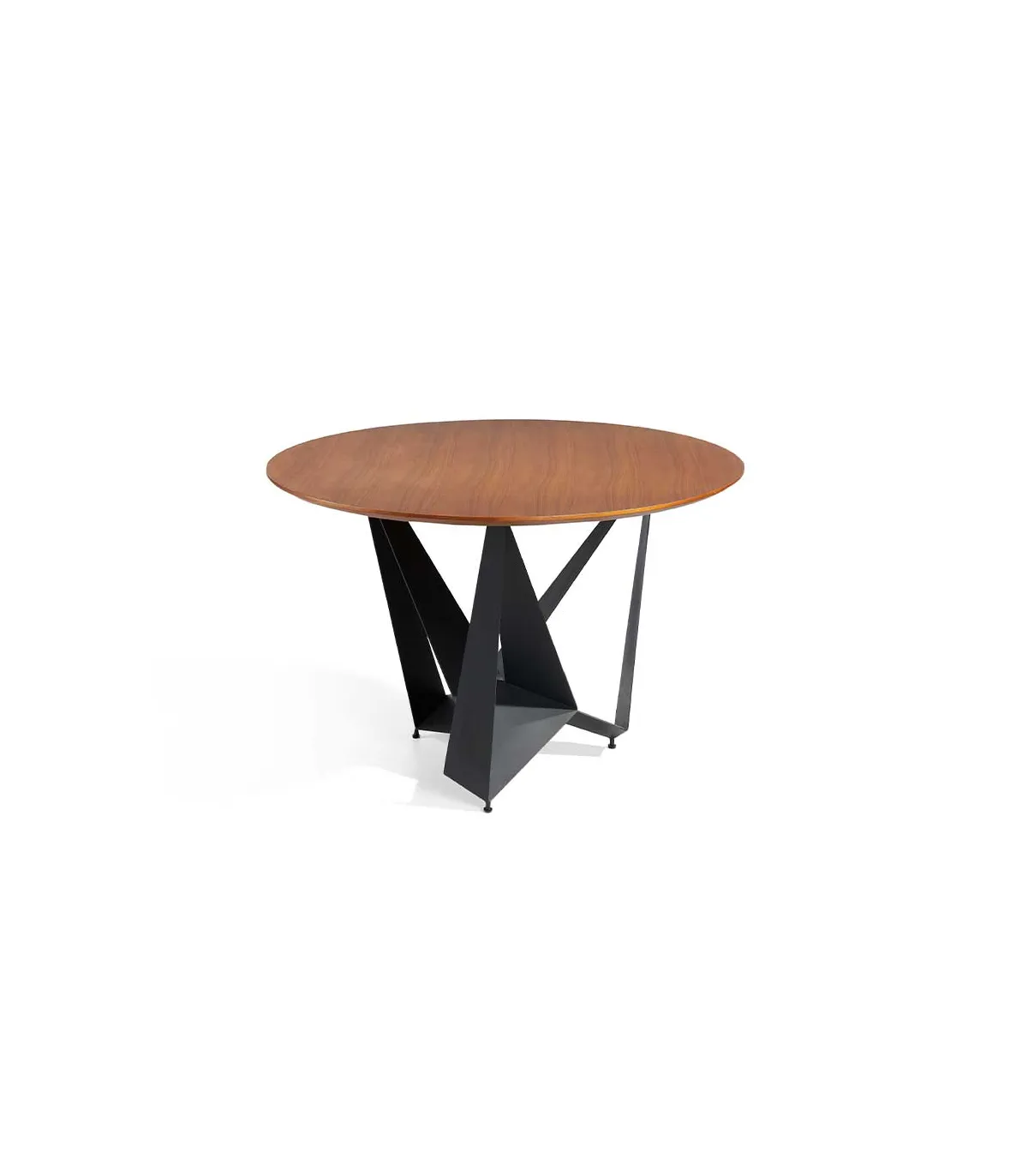Circular fixed dining table with MDF top in walnut veneer finish.