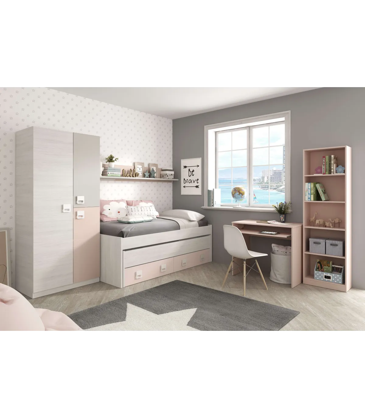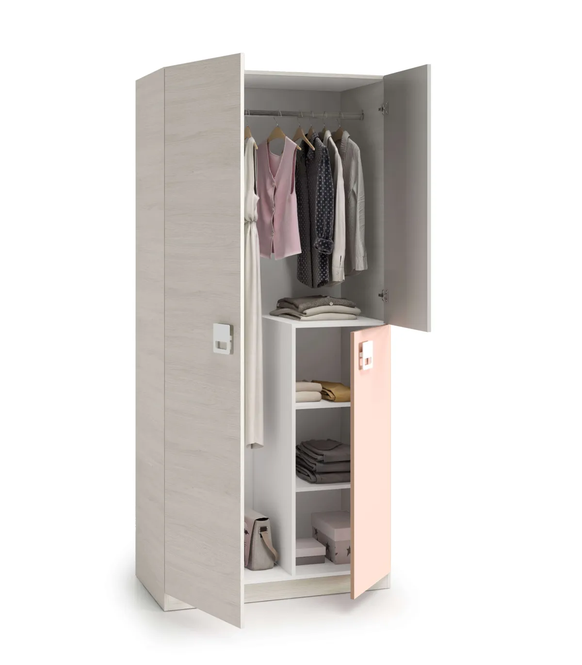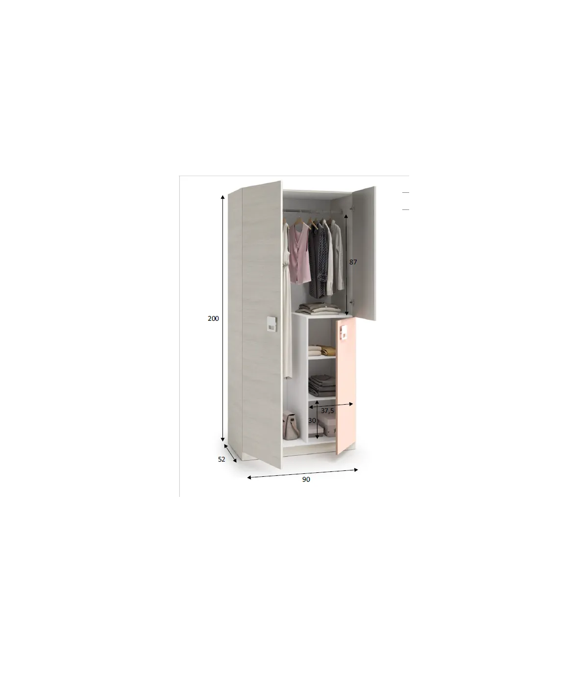 Inside it has a horizontal bar that crosses the middle of the closet to hang your clothes, a top shelf to use as a mezzanine and three side shelves to have your clothes folded.