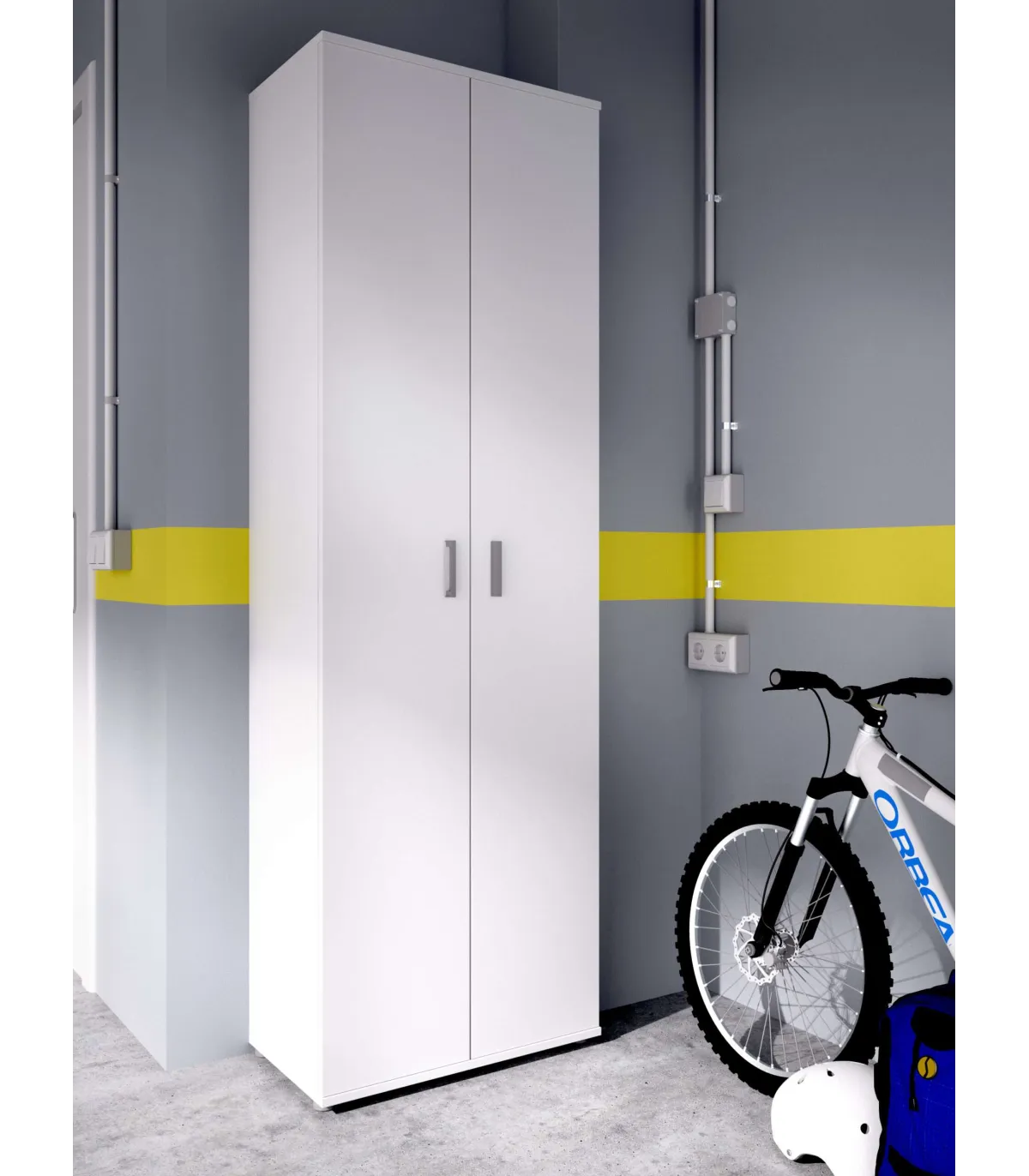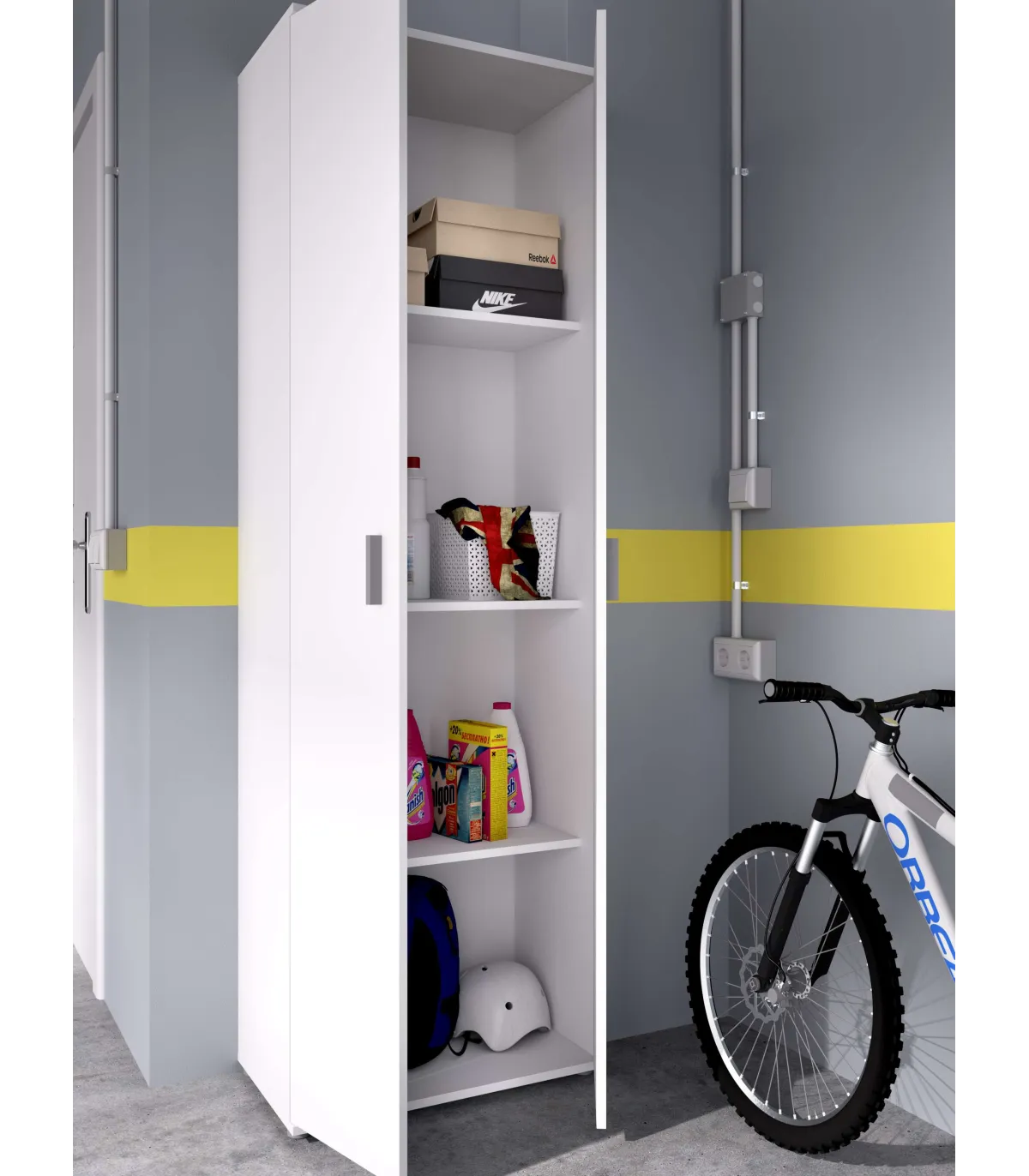 This multipurpose cabinet consists of two doors and three white shelves. It's also perfect for putting it behind a door. Realized in a melaminated agglomerate material.