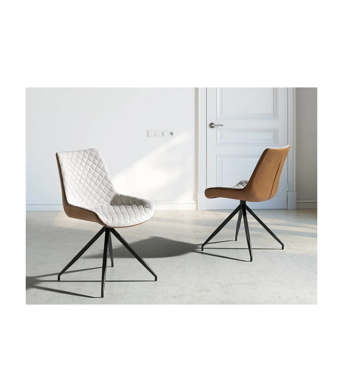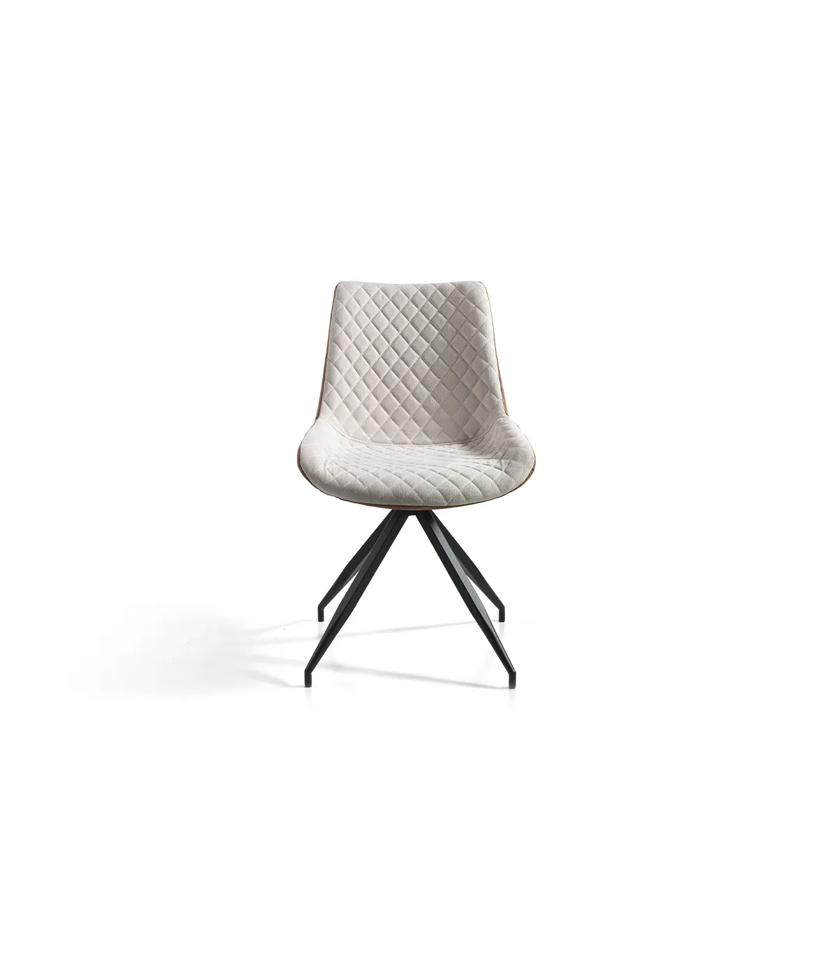 Dining chair upholstered in beige fabric.