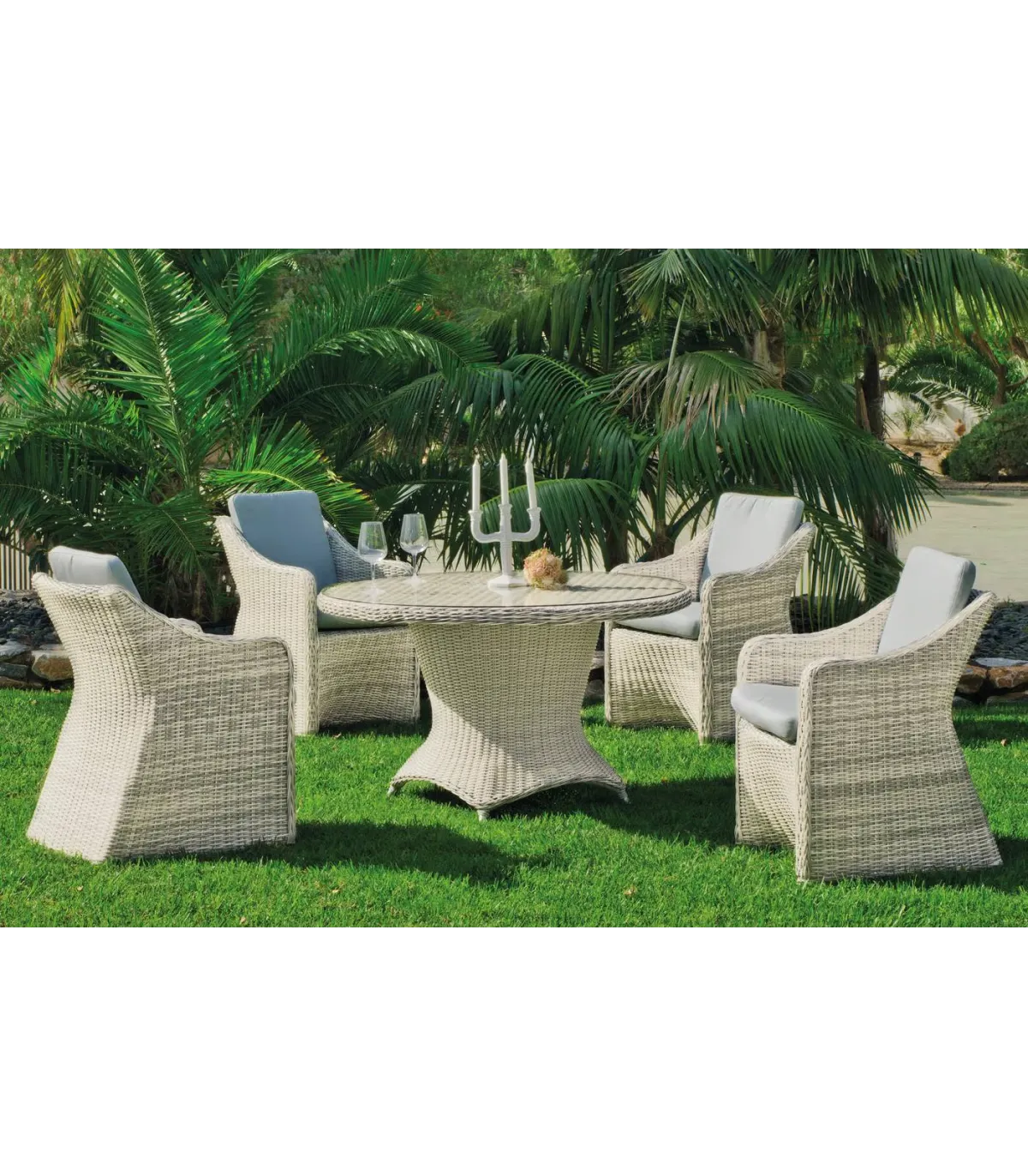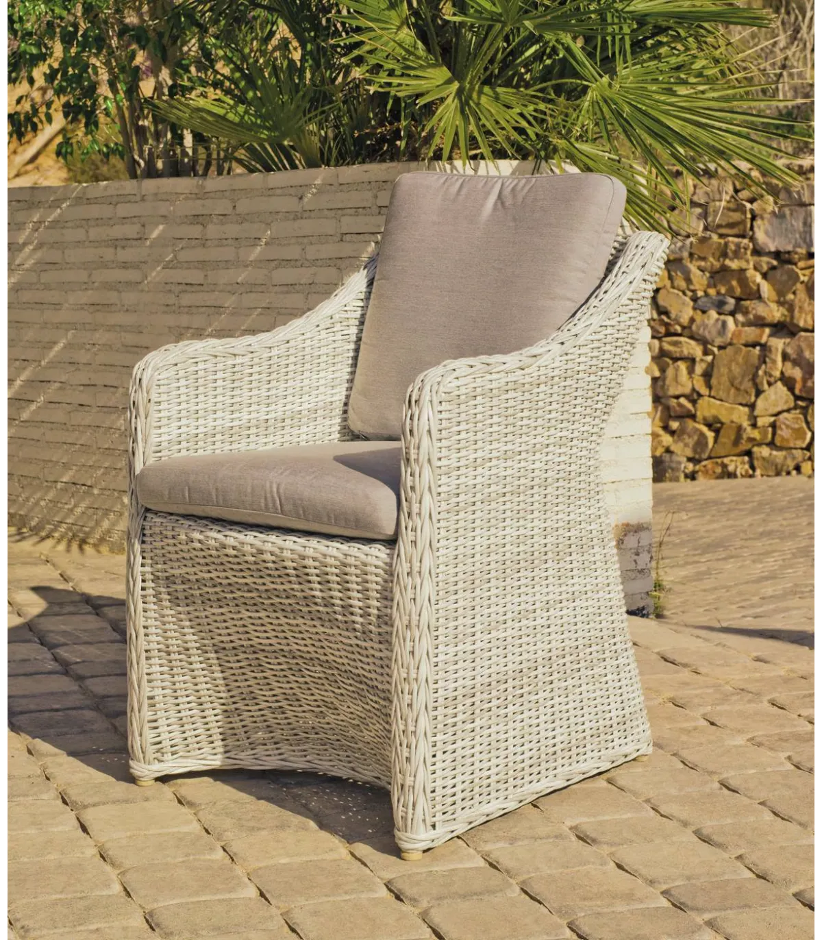 Synthetic marrow dining chair with seat and back cushions, for garden and terrace, elegant and functional. Focused on demanding people looking for quality, careful elaboration and special care in every detail.