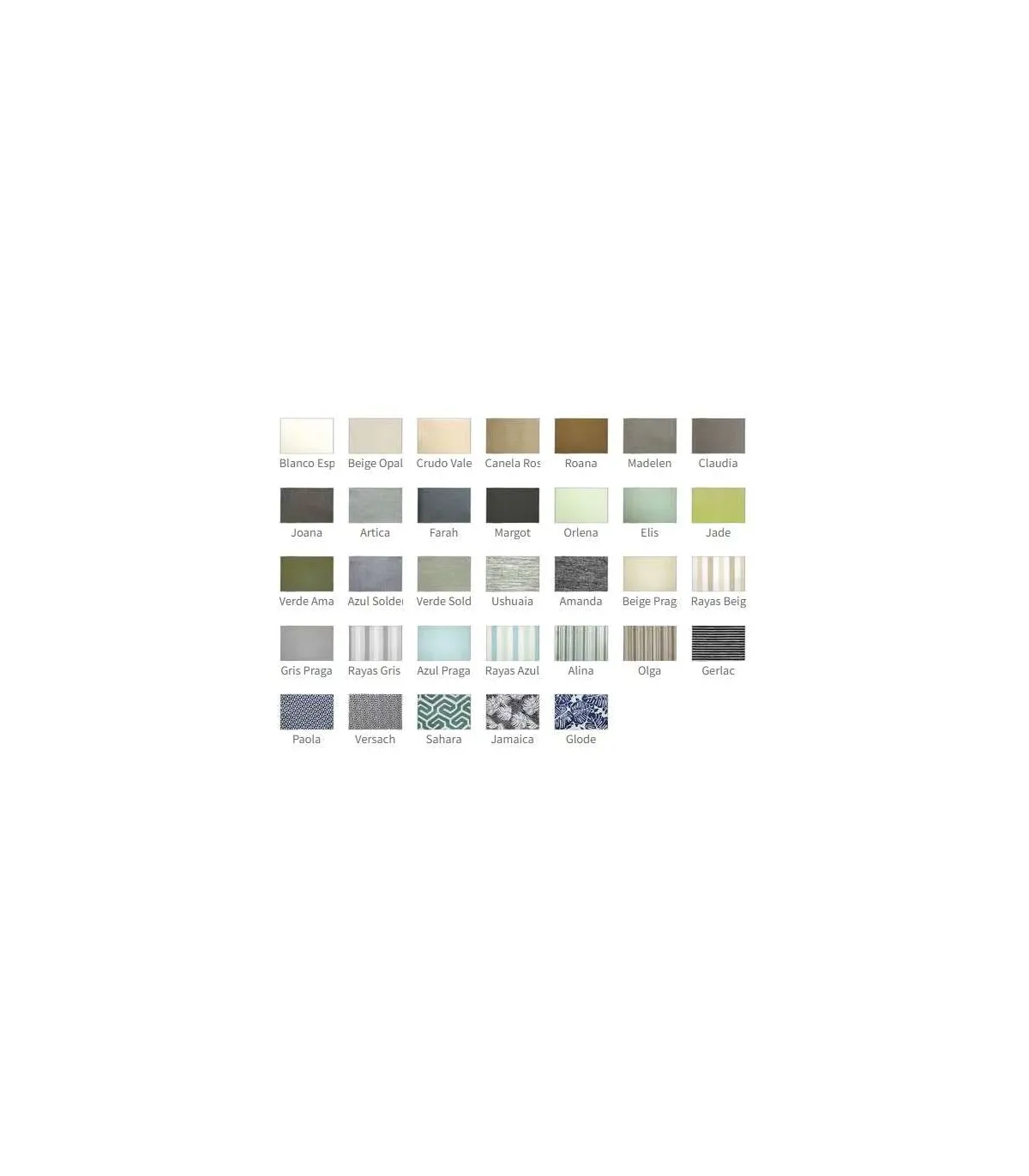 Dralon: acrylic fabric, washable, breathable, fresh and resistant to the outside. It is tinted with special pigmentation to prevent discoloration. It is resistant to stains and fungi. Supports ironing and dryer drying. It does not need maintenance and its cleaning is with mild soap and water.