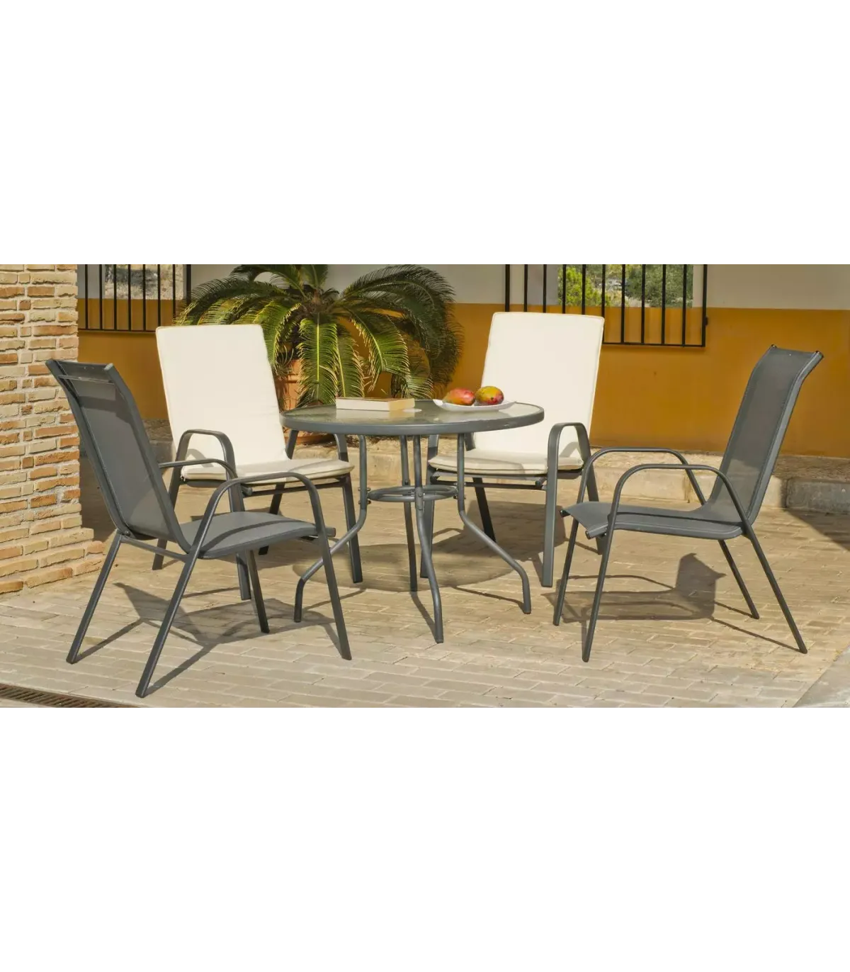 Table set + 4 armchairs for garden and terrace, made of steel. Anthracite grey structure.