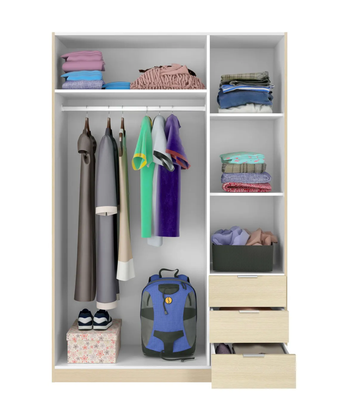 Inside it has a horizontal bar that crosses the middle of the closet to hang your clothes, a top shelf to use as a mezzanine and three side shelves to have your clothes folded.