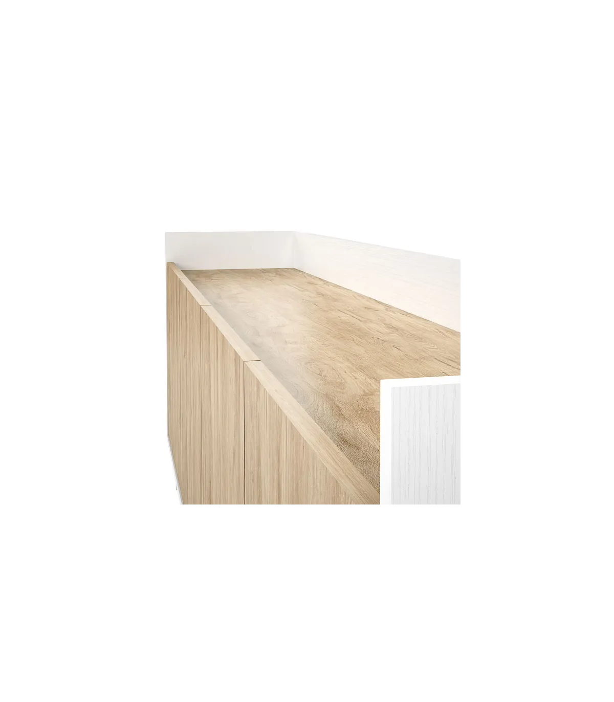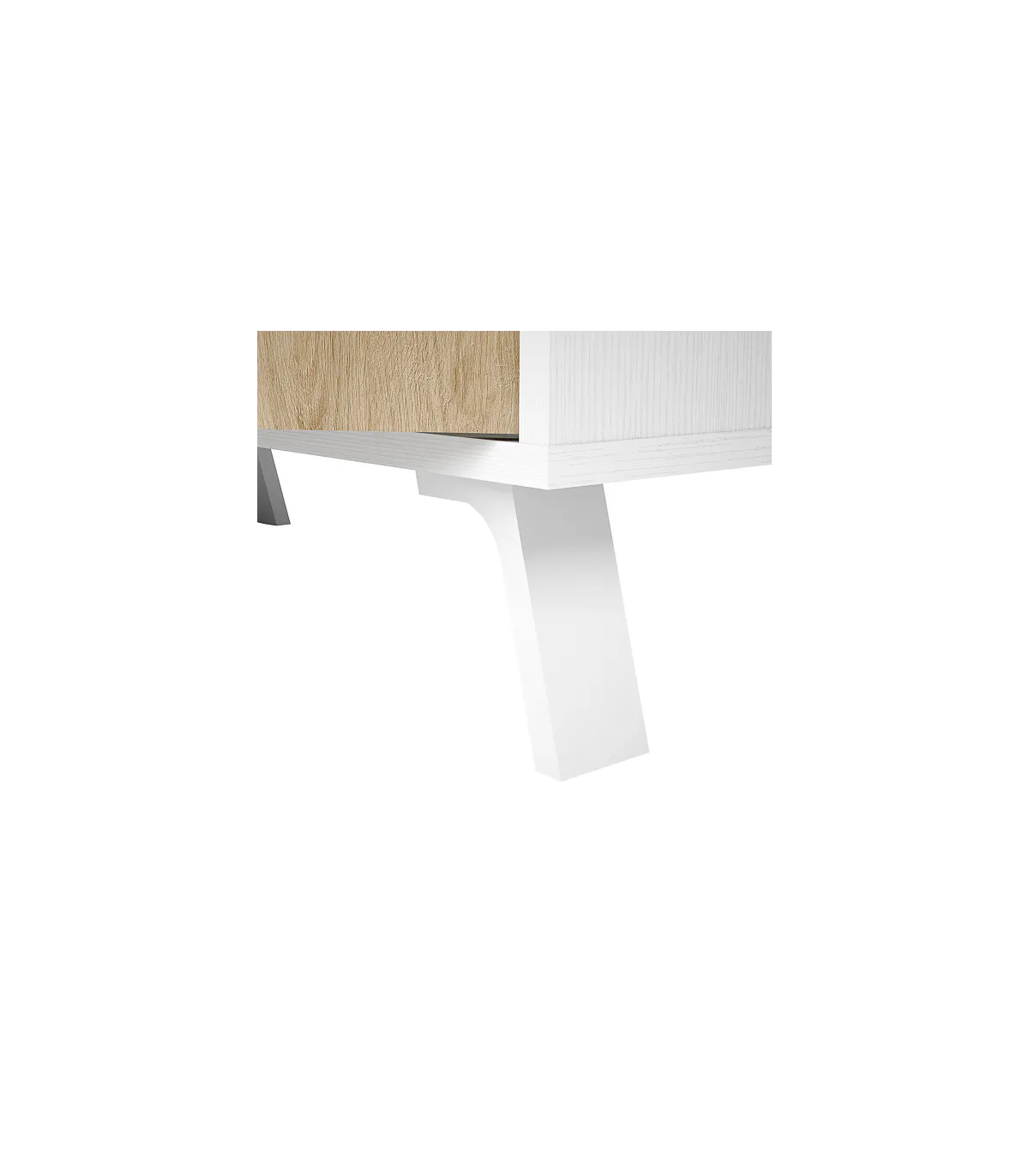 This Stylus Plus 3 Door Lounge Sideboard has three doors with melaminated agglomerate finish with a board thickness of 25 mm with shelves, in color combined in gloss white and Canadian oak