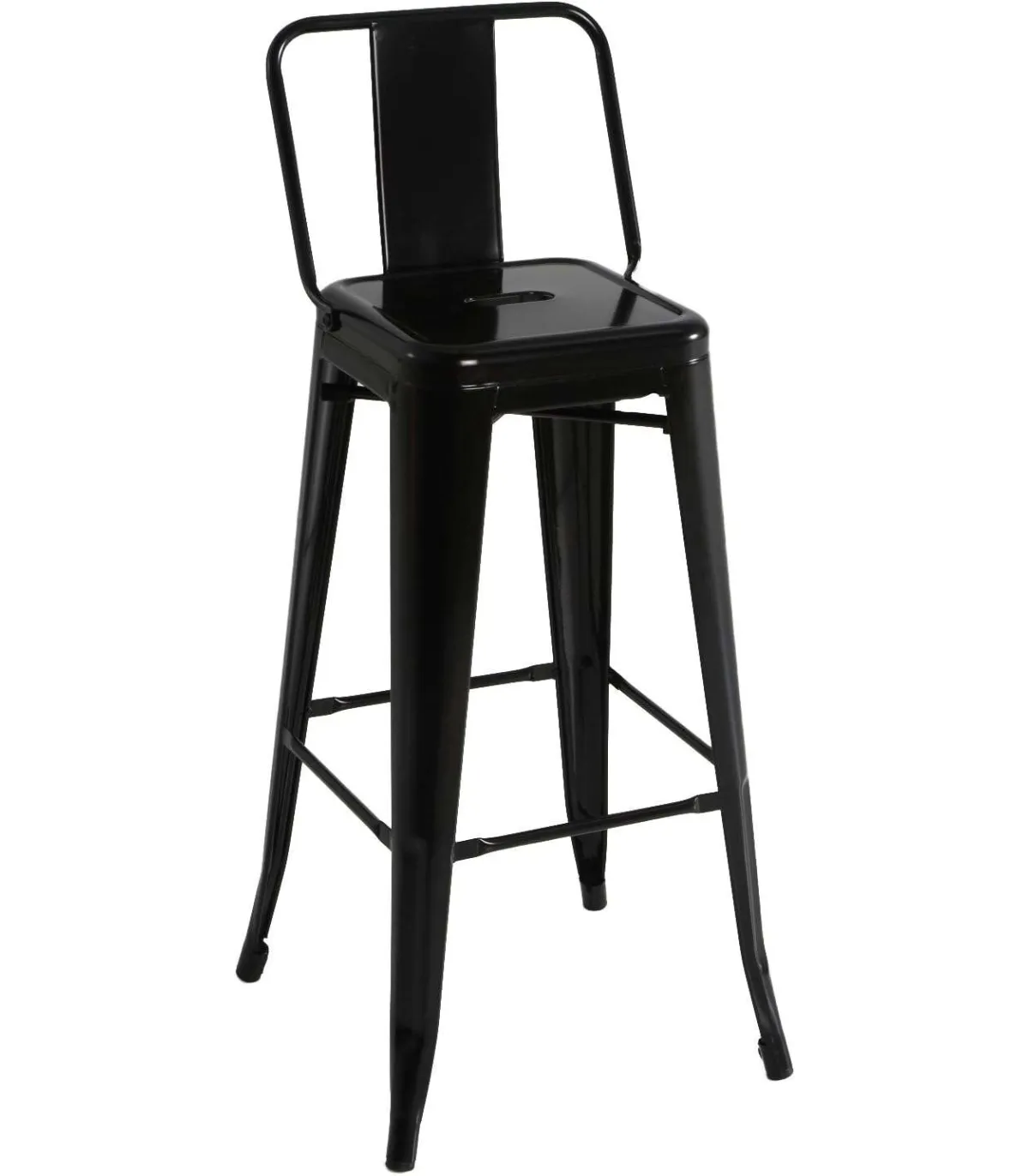 Taburete de metal apilable disponible en negro. Perfecto para darle un toque industrial a la cocina o barra del bar.