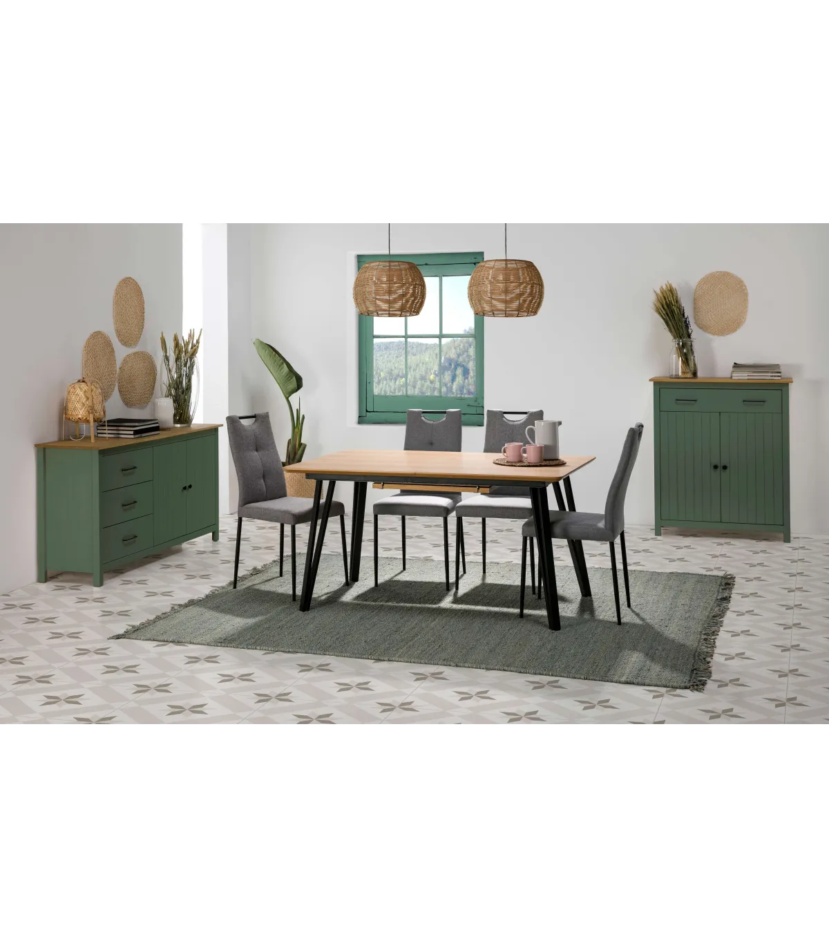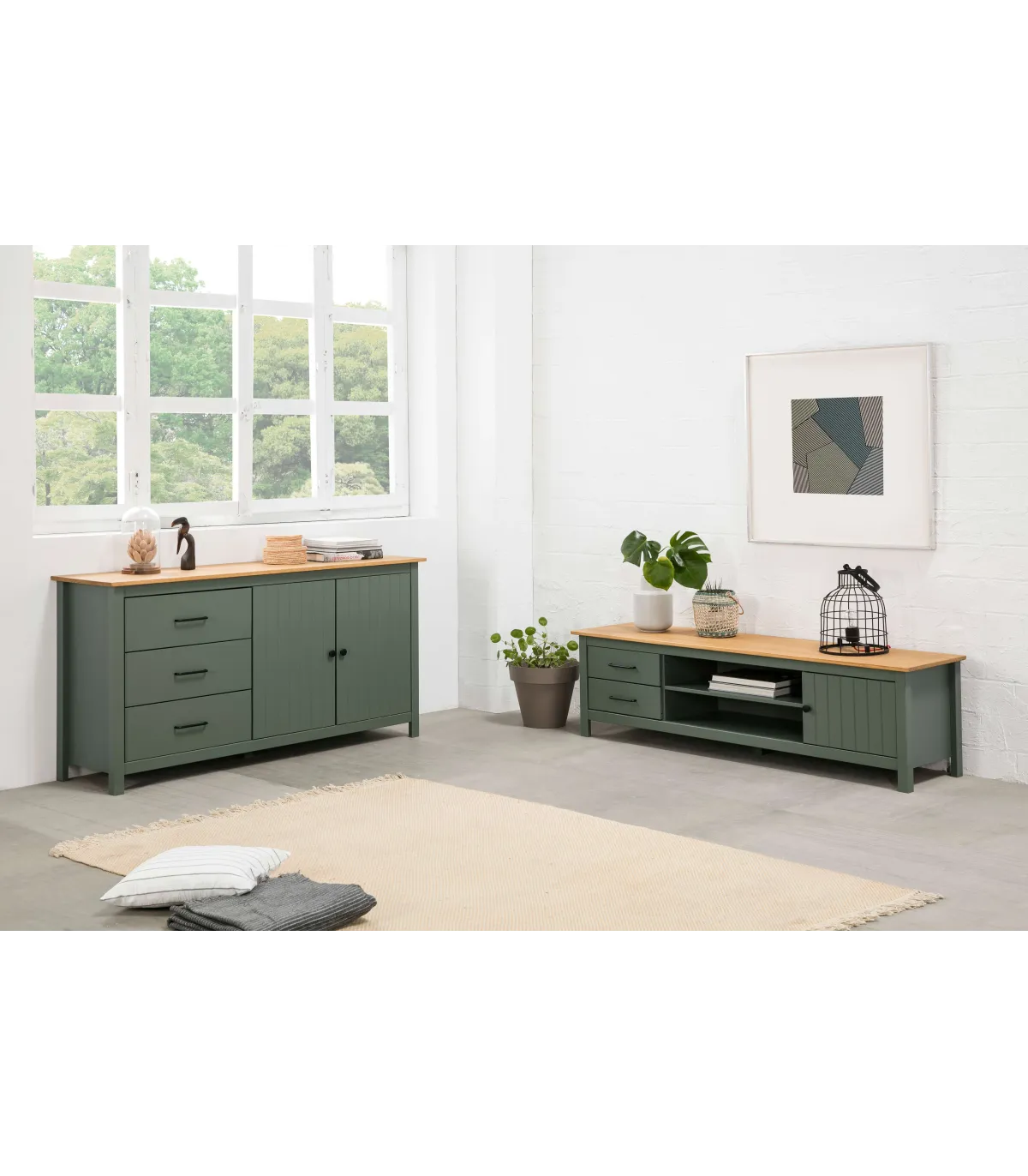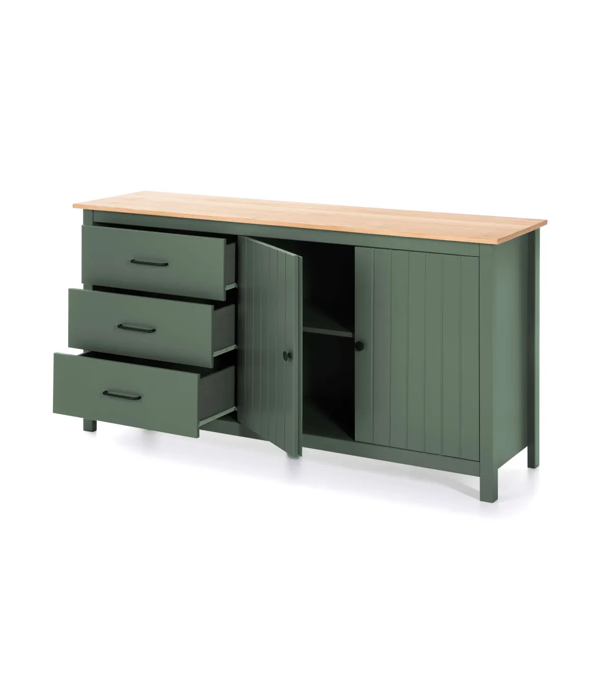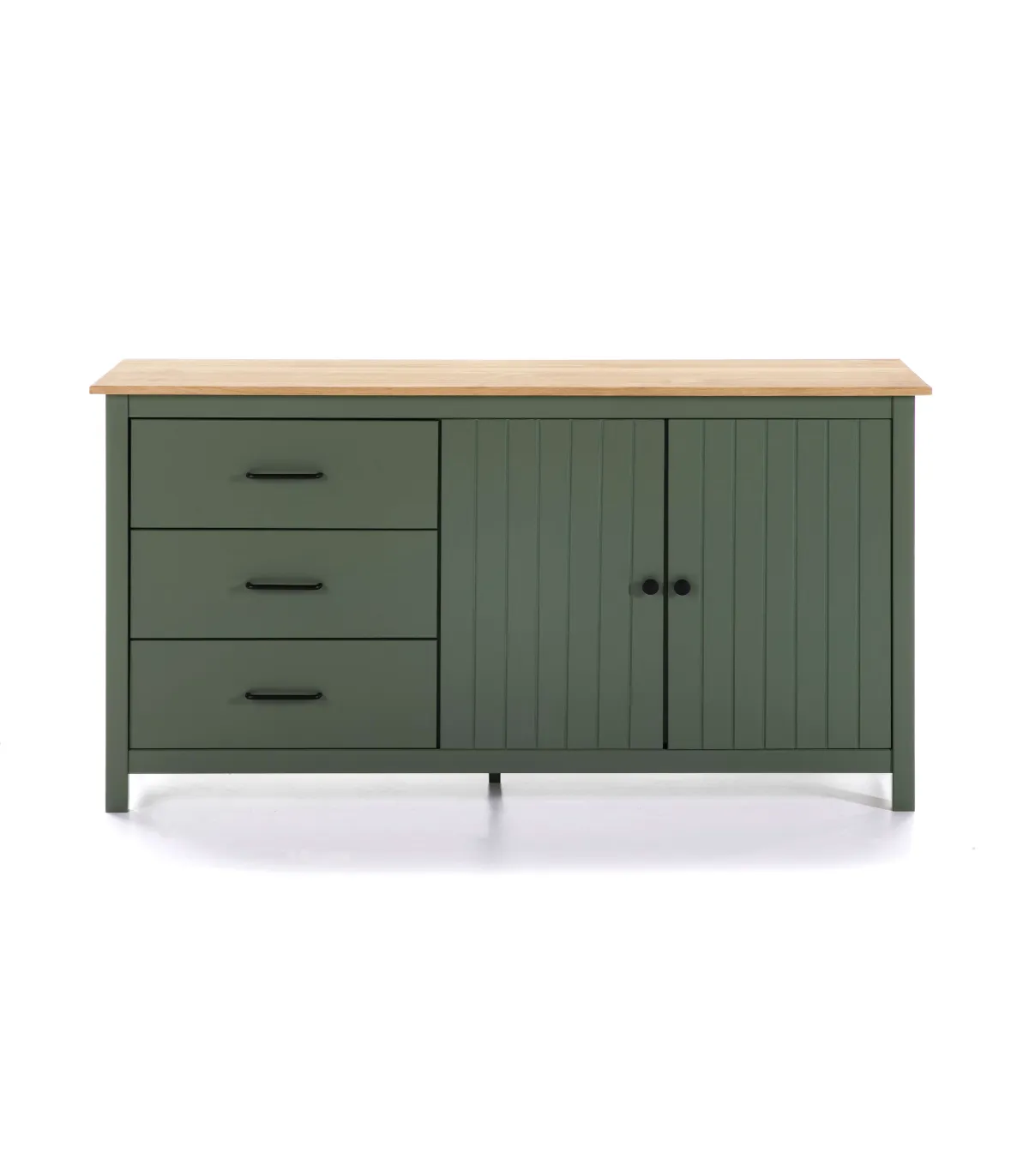 El aparador presenta un acabado lacado en color verde que aporta un toque de frescura y vitalidad. Su tapa en tono natural agrega un contraste cálido y auténtico, resaltando la belleza de la madera.