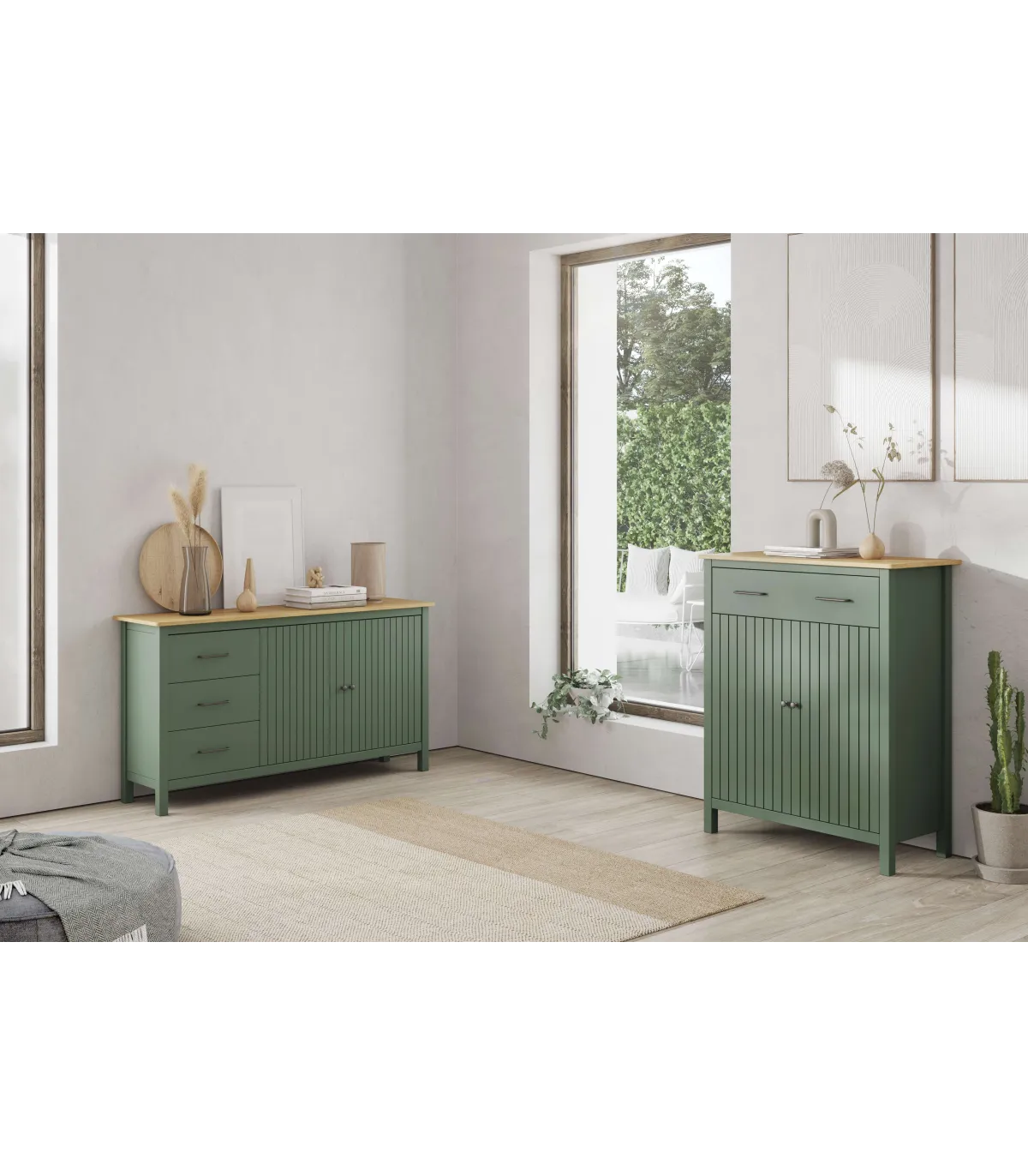 La funcionalidad está garantizada por tres cajones amplios equipados con guías metálicas de apertura suave. Además, el aparador cuenta con dos puertas batientes con una balda interior, ofreciendo un espacio práctico para organizar tus objetos.