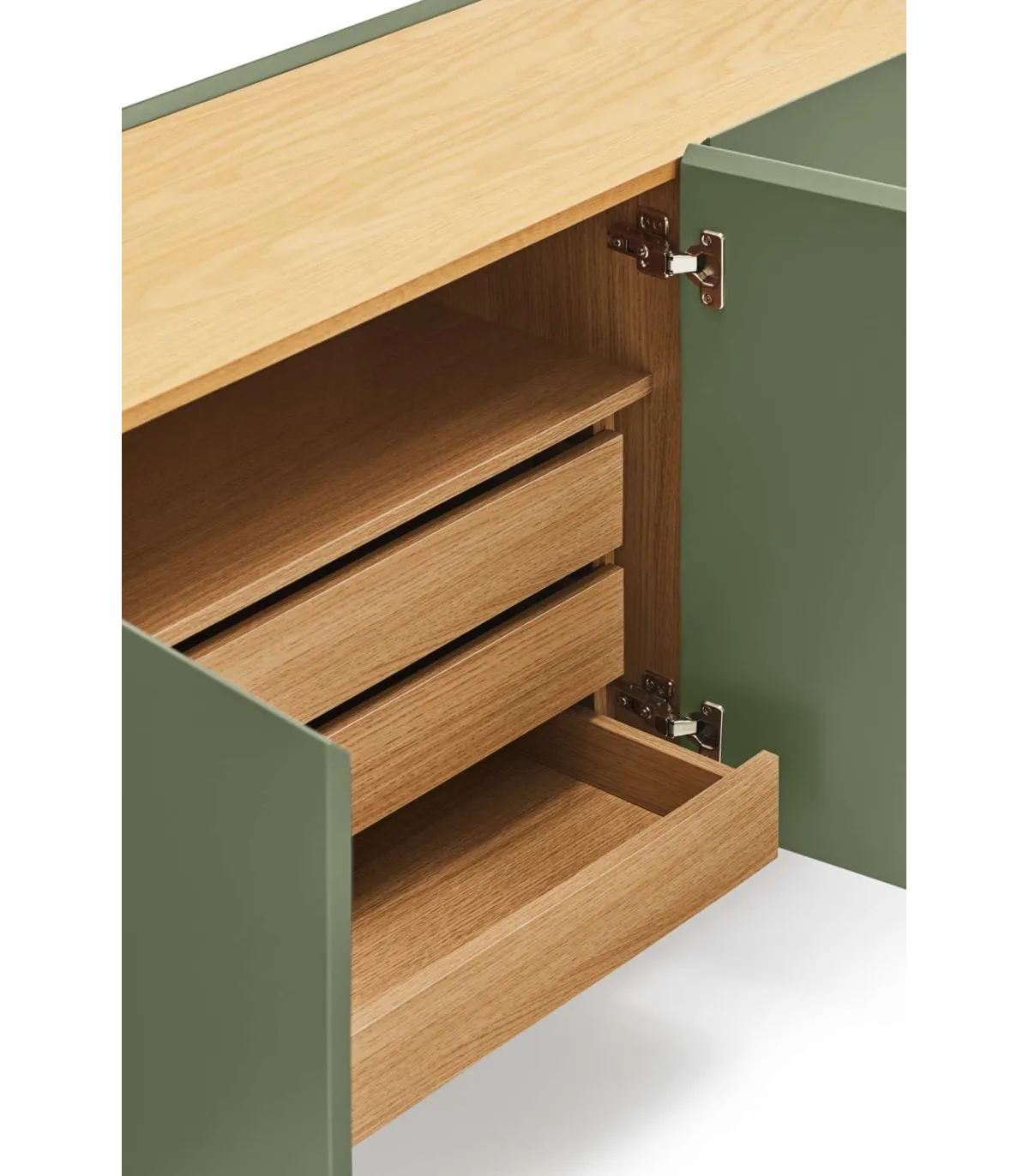 El aparador Arista tiene un diseño moderno y minimalista con estilo nórdico. Sencillo y funcional. Con un marco alrededor del perímetro superior del mueble en roble natural que contrasta con el resto lacado y lo hace mas original. Dispone de cuatro puertas, dos de ellas con huecos y tres cajones y la otras puertas dispone de dos baldas  para organizar mejor el espacio. Con bisagras de amortiguación para que los cierres sean ligeros y silenciosos.