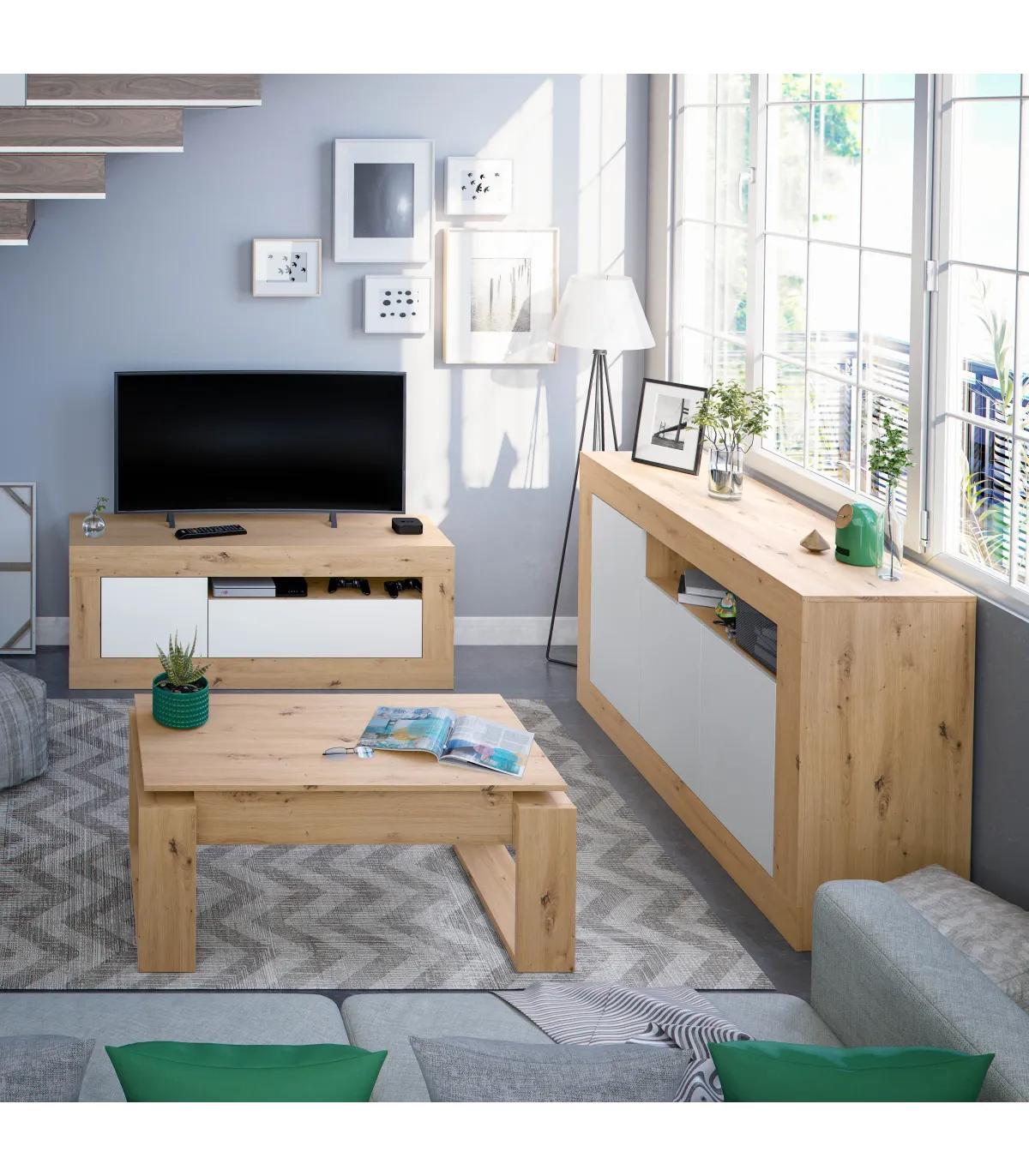 Disfruta de un espacio versátil con la mesa centro Caspe elevable en roble nordish · Medidas: 105x55x45 cm · Estilo moderno y funcional.