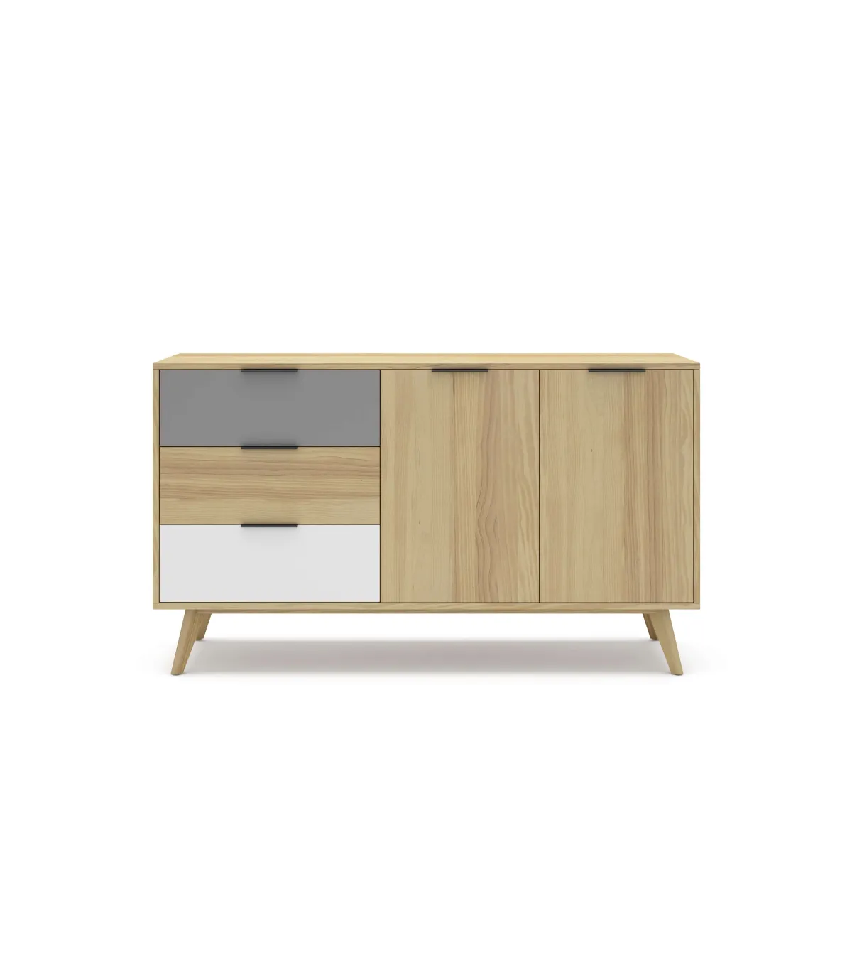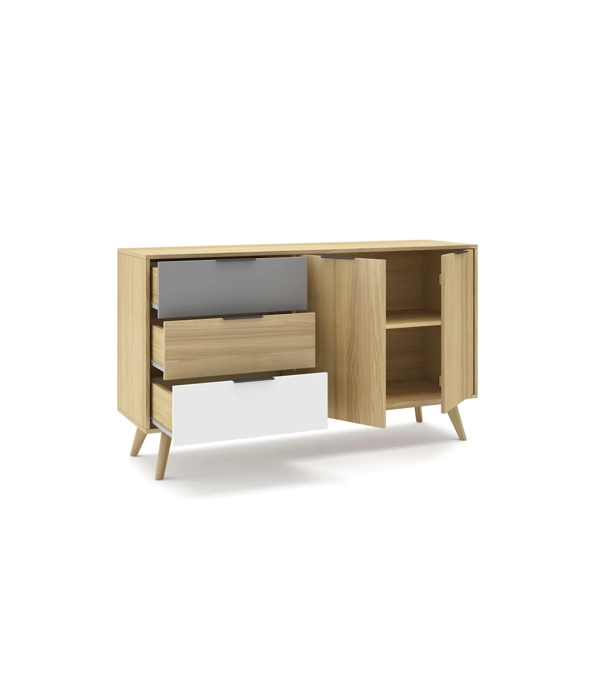 El aparador combina colores roble, gris claro y blanco en su diseño, lo que crea una armonía visual y una sensación de equilibrio en la pieza. El roble aporta un aspecto cálido y natural, mientras que el gris claro y el blanco evocan la luminosidad y frescura característica del estilo nórdico.