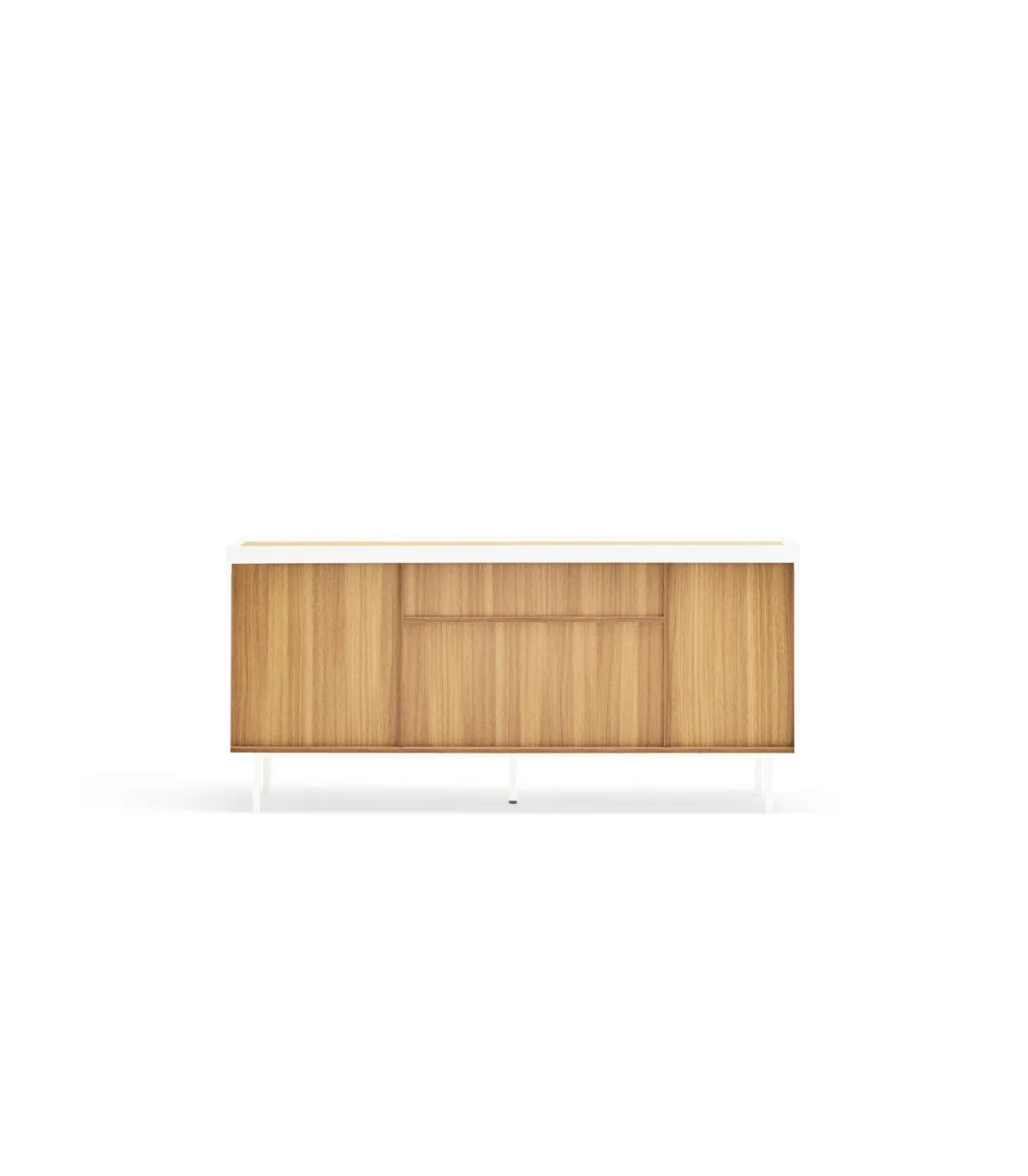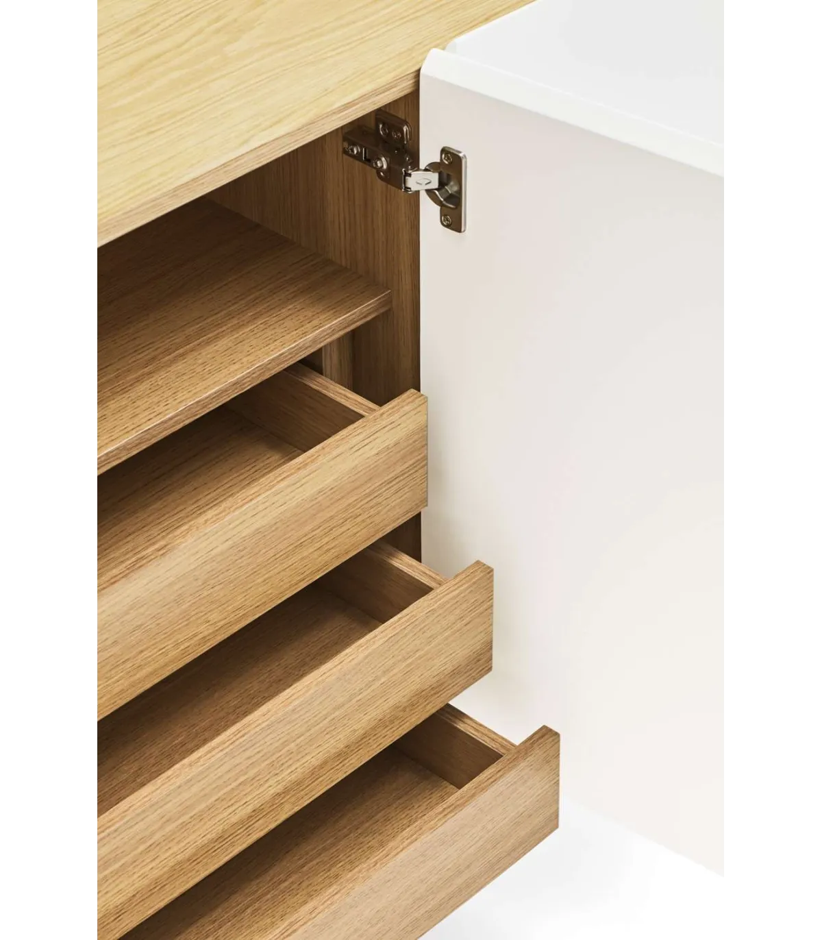 El aparador Arista tiene un diseño moderno y minimalista con estilo nórdico. Sencillo y funcional. Con un marco alrededor del perímetro superior del mueble en roble natural que contrasta con el resto lacado y lo hace mas original. Dispone de cuatro puertas, dos de ellas con huecos y tres cajones y la otras puertas dispone de dos baldas  para organizar mejor el espacio. Con bisagras de amortiguación para que los cierres sean ligeros y silenciosos.