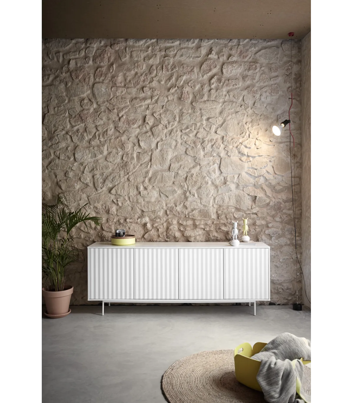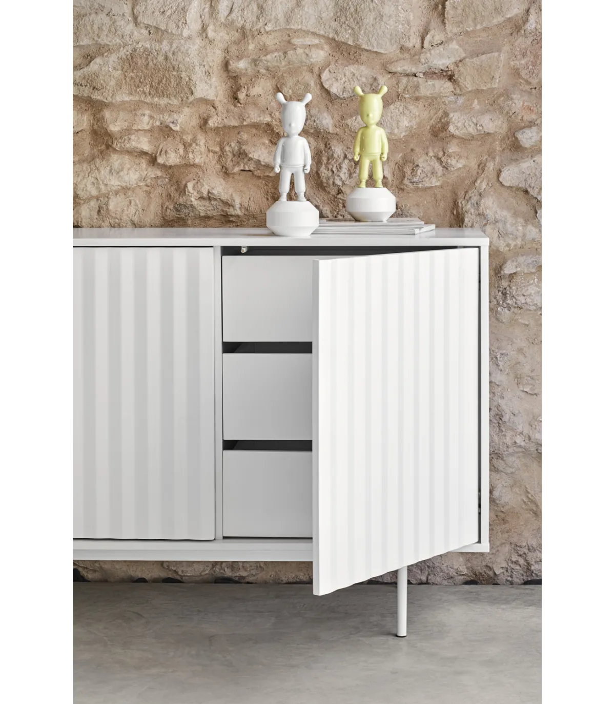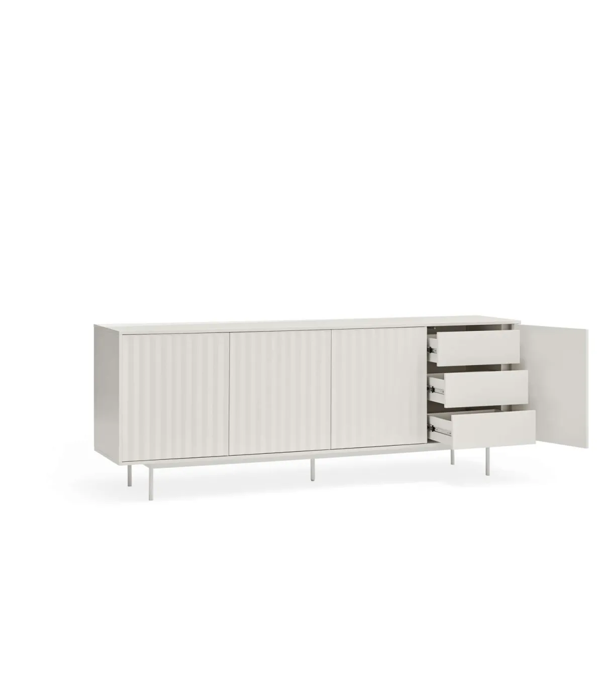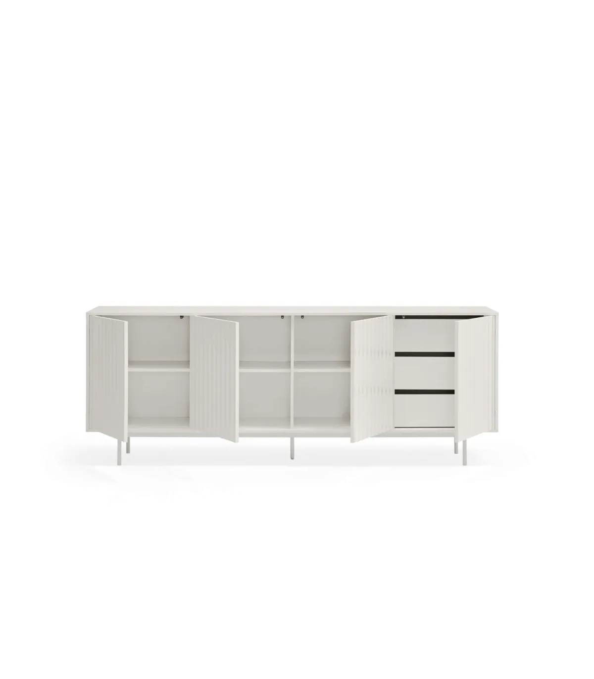 Aparador Sierra presenta sobre sus frontales un relieve dentado particular de la colección sierra. Fabricado en DM lacado mate en color blanco con puertas con apertura push, con cajones interiores.