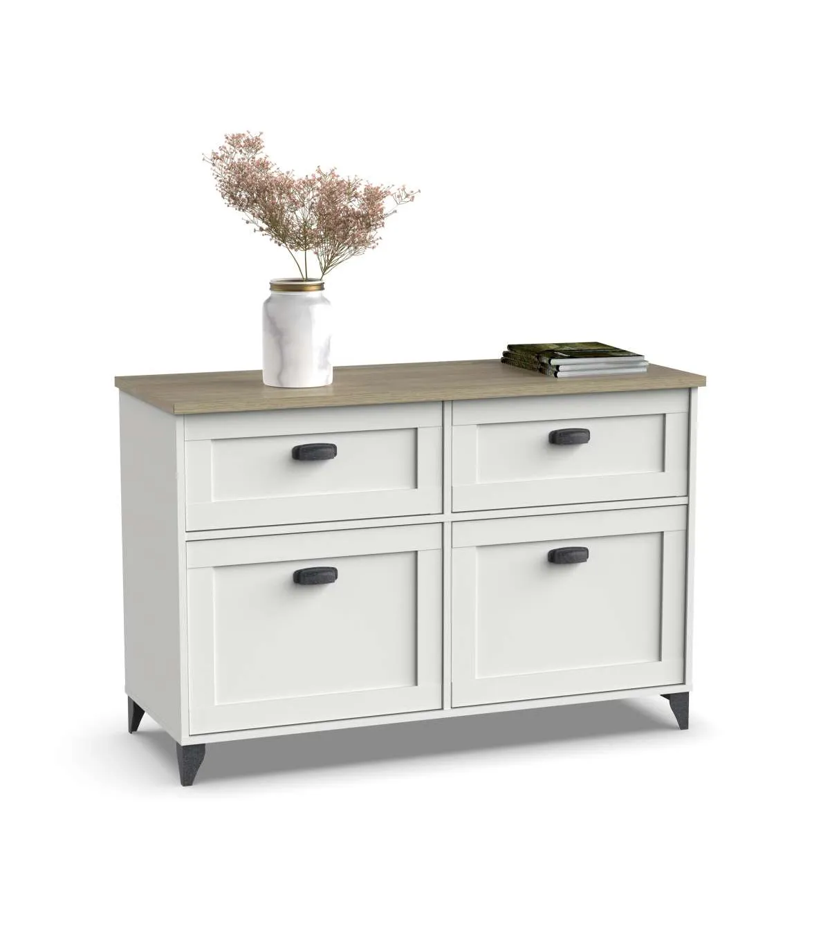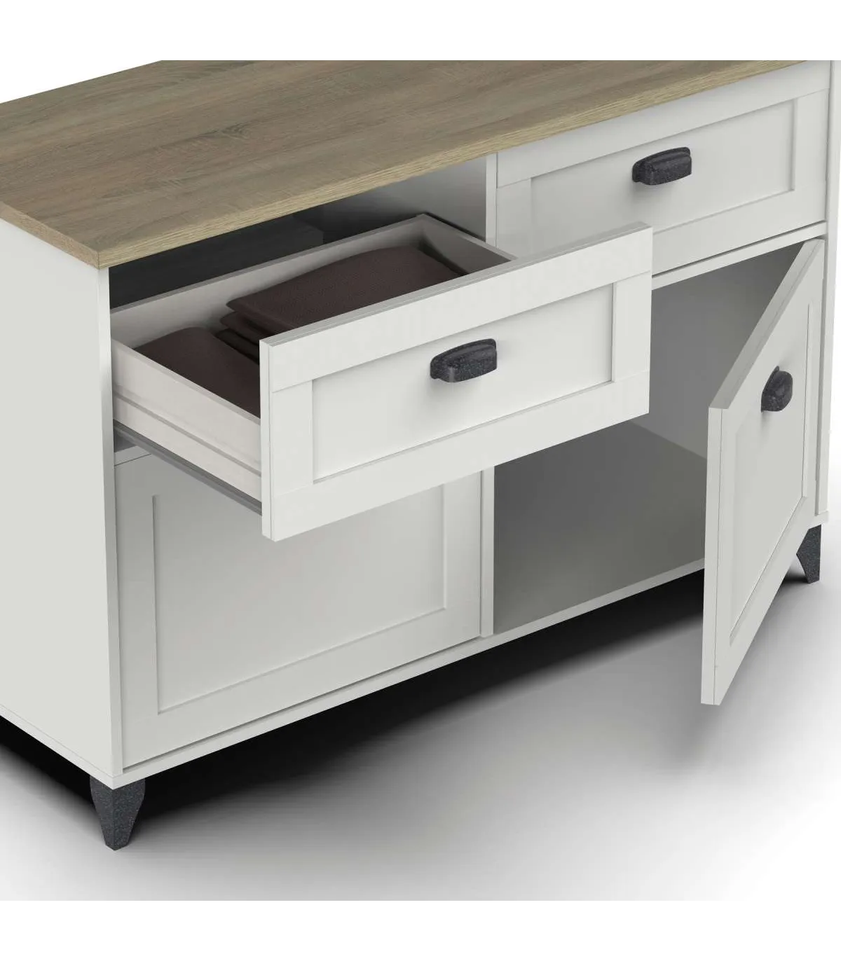 Mueble aparador Portobello, dispone de dos puertas y dos cajones, es una pieza para los enamorados del cottage. La tapa en acabado Cambria, tiradores y patas en acabado metalizado.