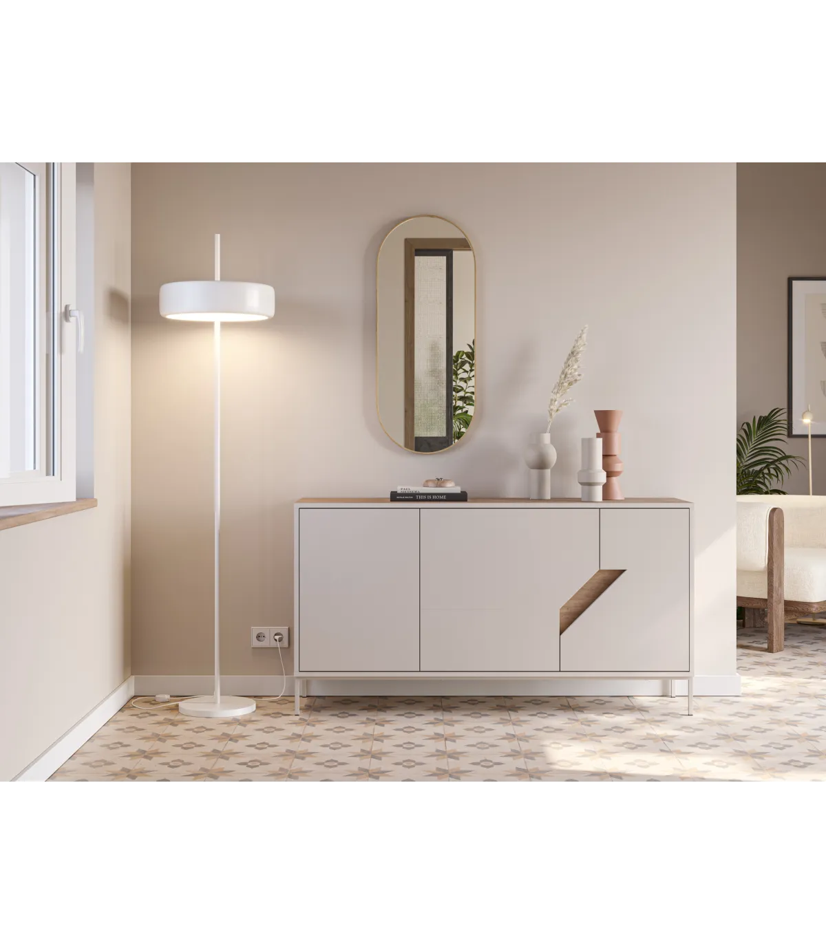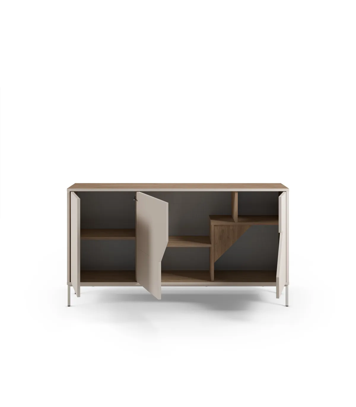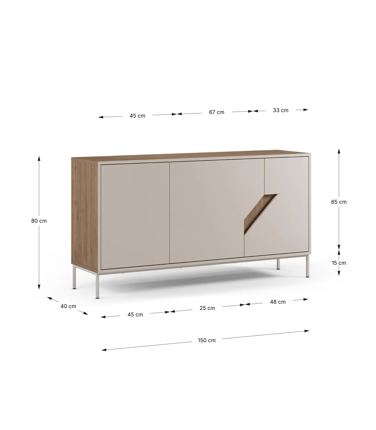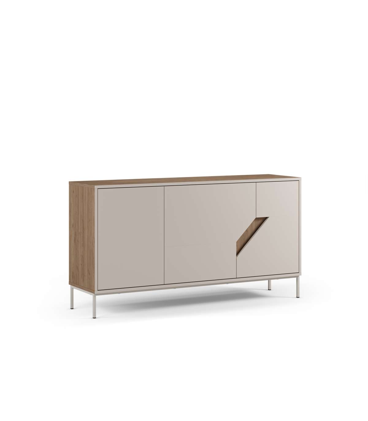 Aporta estilo y funcionalidad a tu hogar con el aparador Rómulo · 3 puertas · acabado crema/roble sepet · 150 cm de ancho.