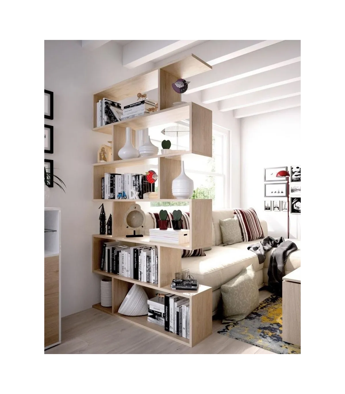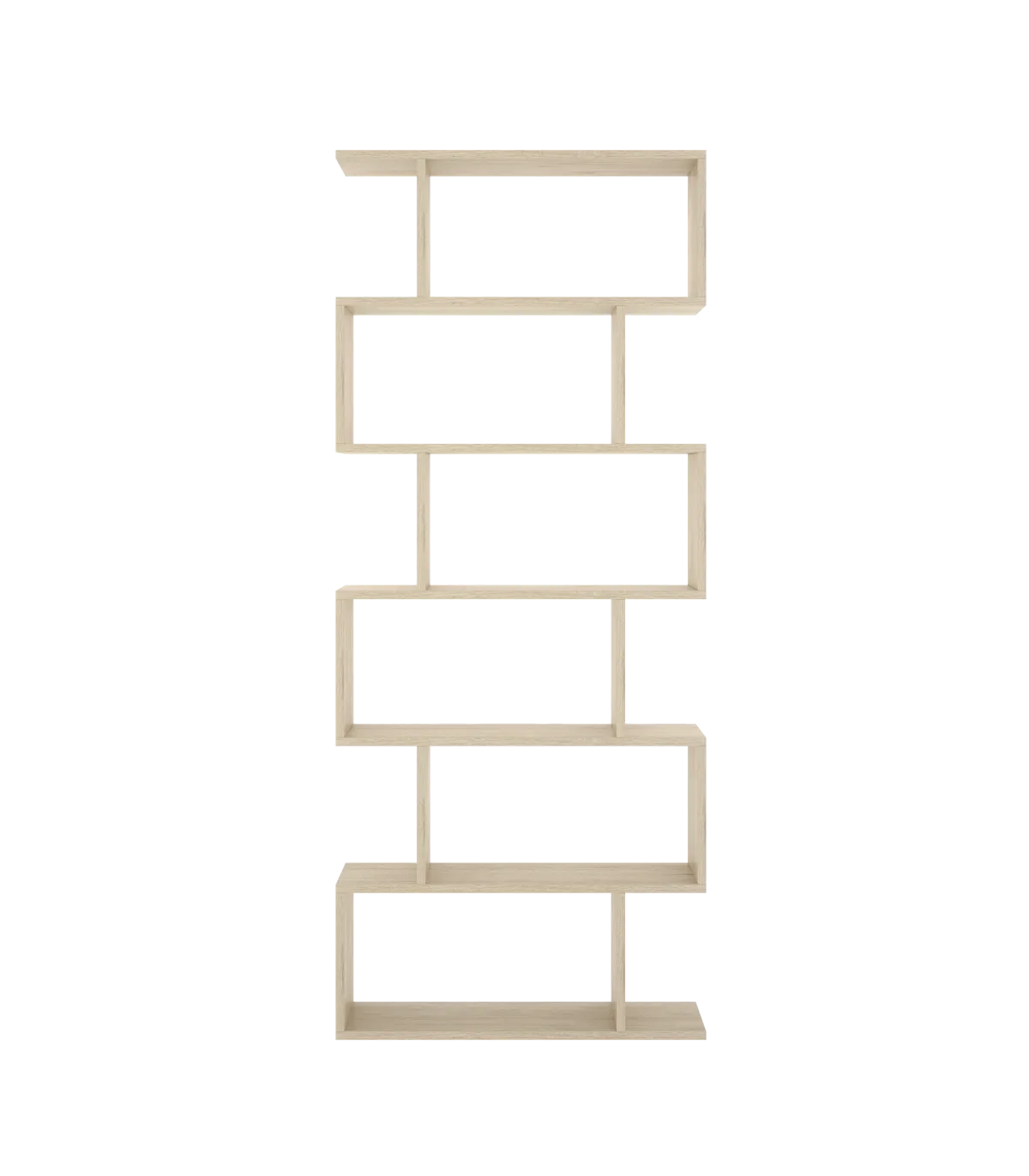 Sencilla y moderna estantería tipo zig-zag para oficina o salón. Perfecta para separar ambientes. Acabado natural. Fabricado en aglomerado melaminizado.