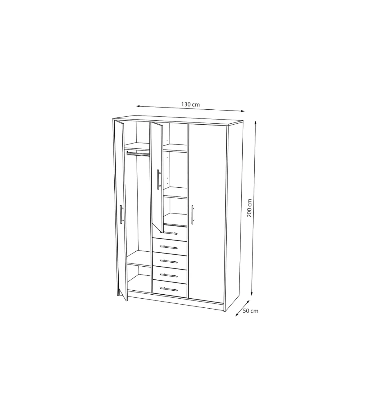 Con su diseño de tres puertas abatibles y cinco cajones, este armario proporciona una solución completa de almacenamiento para tu ropa y accesorios. Su acabado en color blanco le confiere un aspecto fresco y moderno, complementando cualquier estilo de decoración en tu hogar.