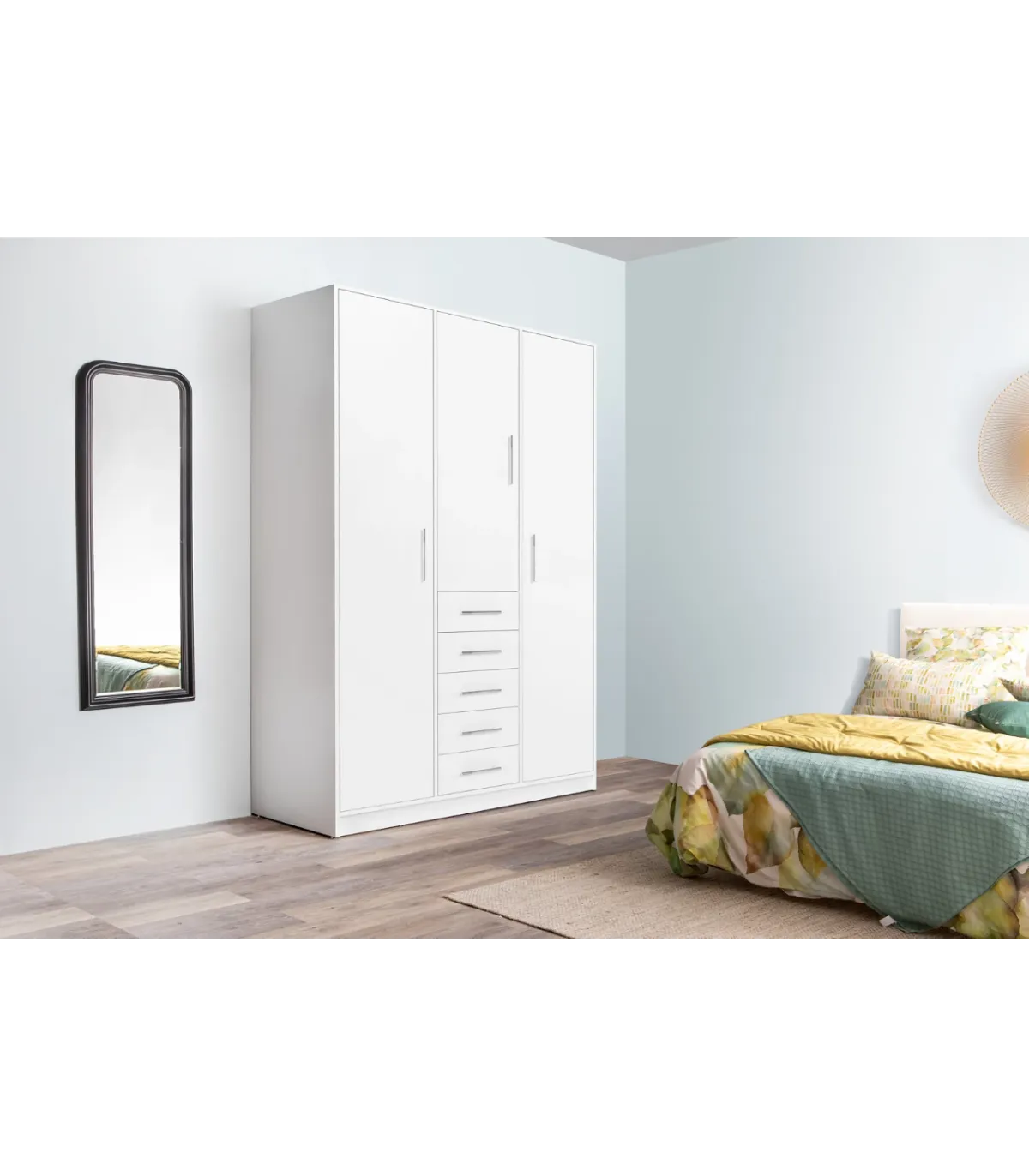El armario de 3 puertas abatibles y 5 cajones en color blanco es un producto práctico y espacioso. Fabricado en melamina, garantiza durabilidad y resistencia.