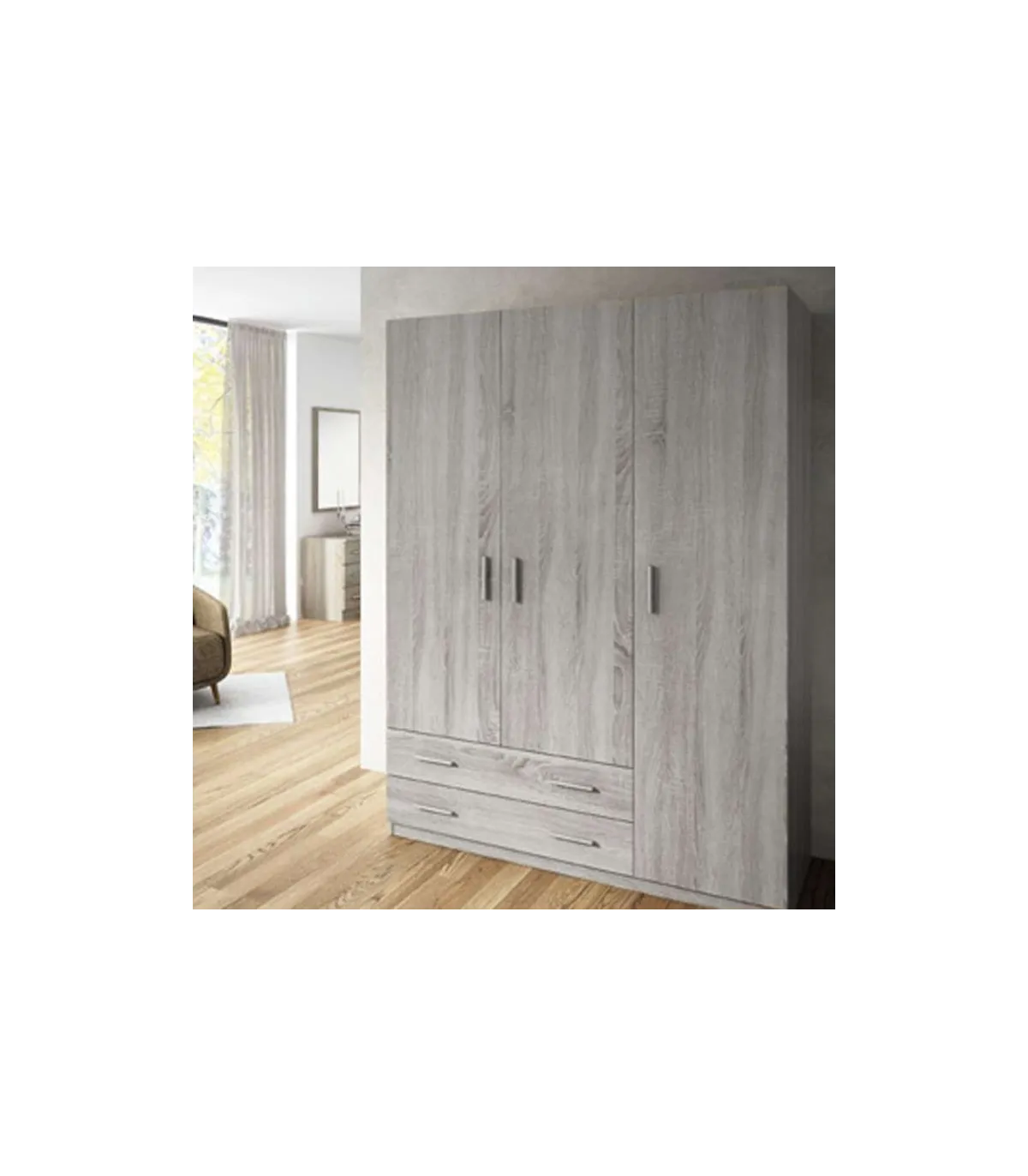 Armario ropero con tres puertas abatibles y dos cajones en color artico, es la solución perfecta para tener organizado el dormitorio. Con un diseño elegante y funcional, ofrece un amplio espacio de almacenamiento mientras combina armoniosamente tonos neutros que iluminan y amplían el espacio.