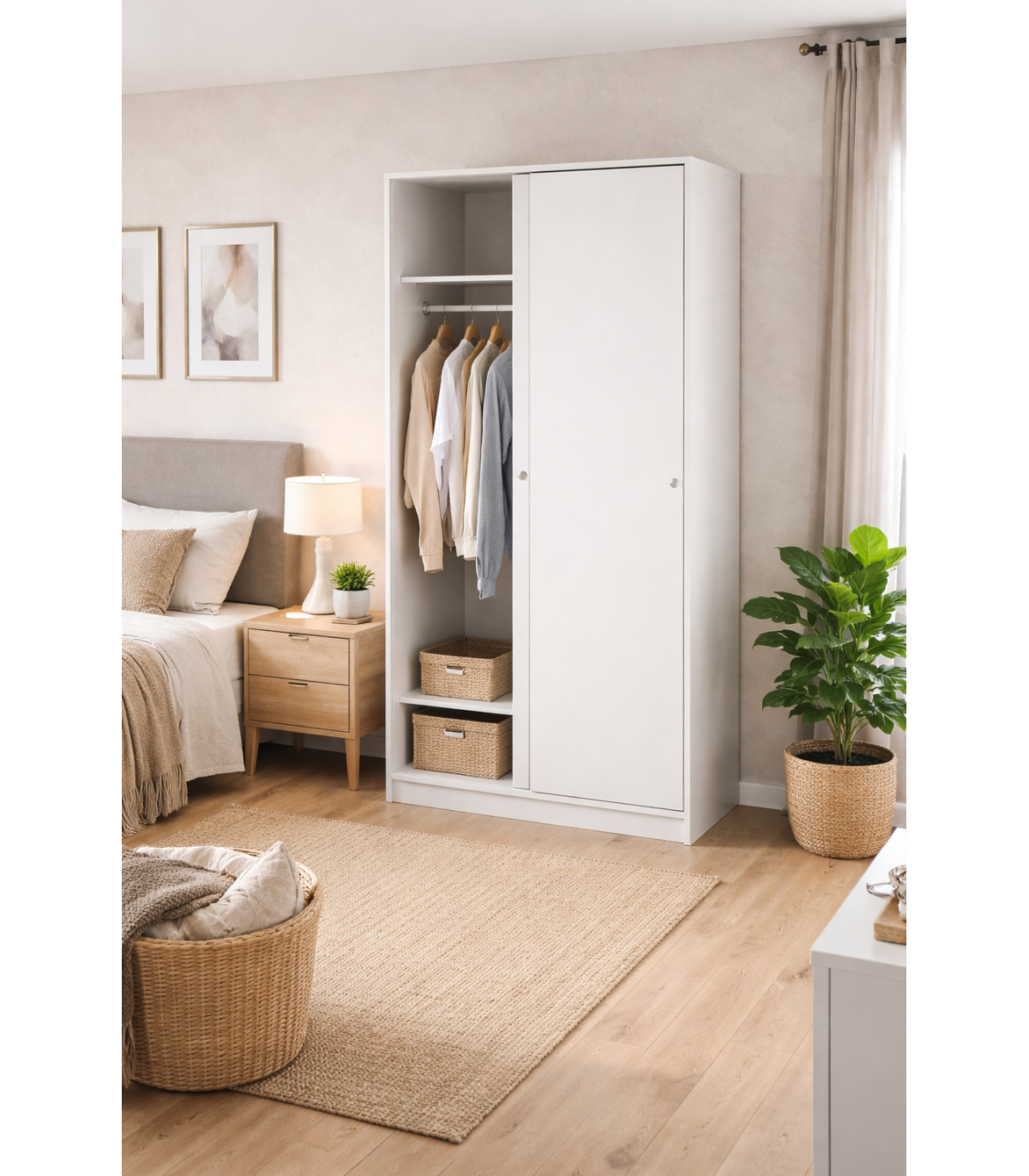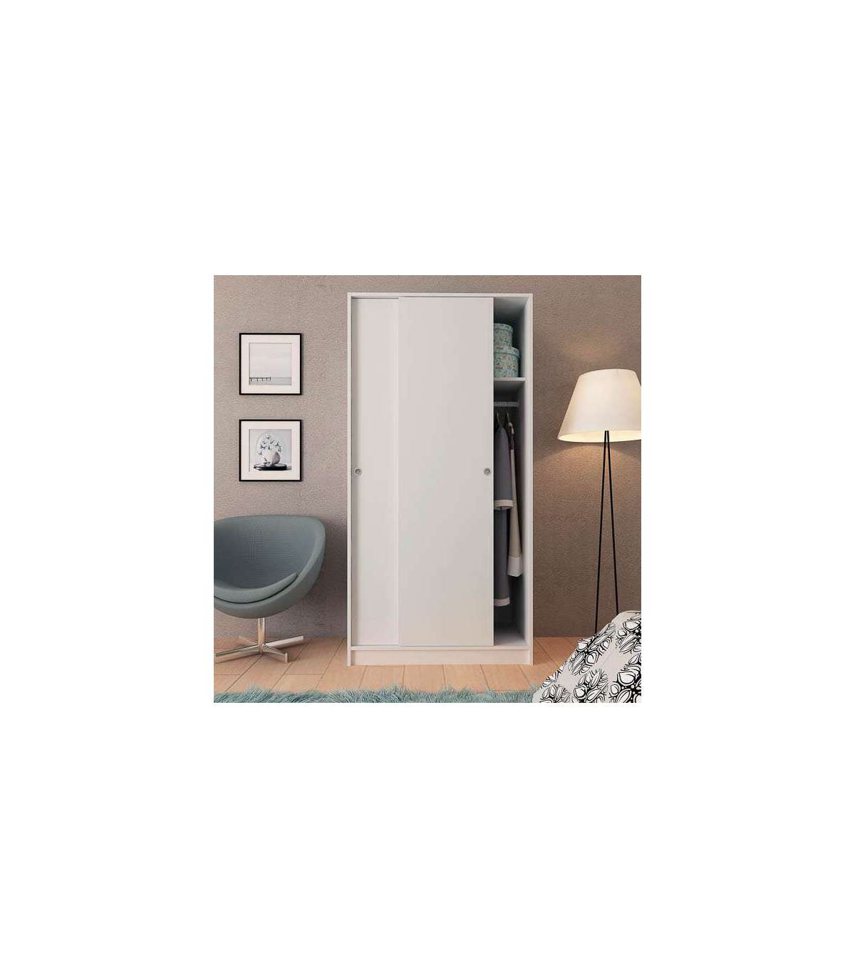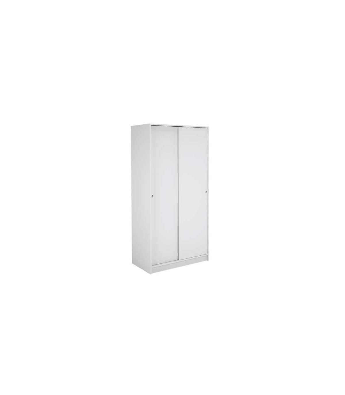 Armario 2 puertas correderas, fabricado en melamina acabado en color blanco. Incluye una balda y una barra para colgar ropa.