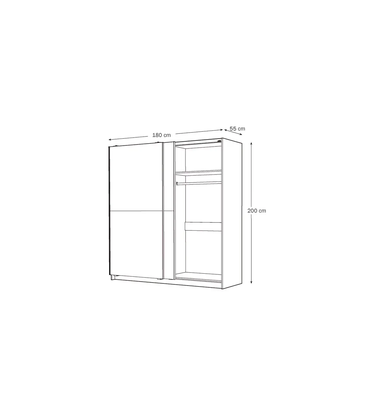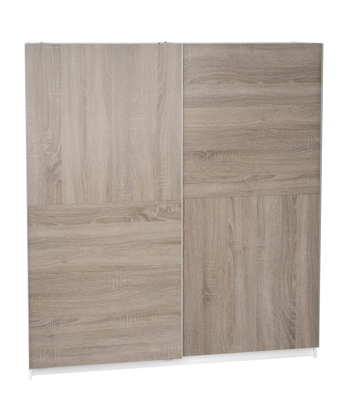 El armario de 2 puertas correderas color roble cortez/blanco es un producto fabricado en melamina. Su diseño incluye una separación vertical en el interior mediante una tabla en el centro. Cada parte del armario cuenta con una balda y una barra para colgar la ropa, brindando así un espacio organizado y funcional para almacenar tus prendas. Con su elegante acabado en color roble cortez combinado con blanco, este armario es una opción práctica y estilizada para cualquier habitación.