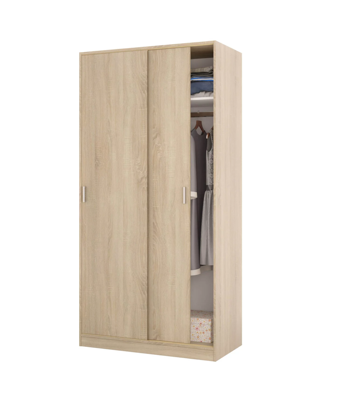 Armario de 2 puertas correderas en color roble canadian con una barra de colgar y un estante en su interior. Sus guías correderas ABS garantizan un deslizamiento suave y su interior blanco aporta luminosidad.