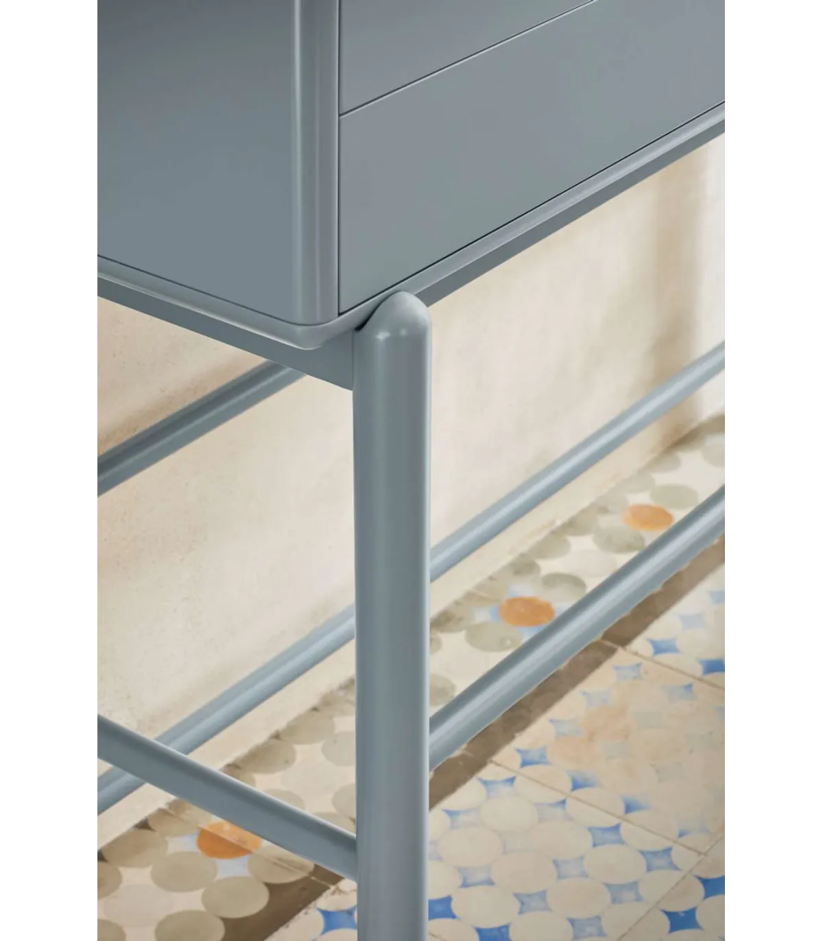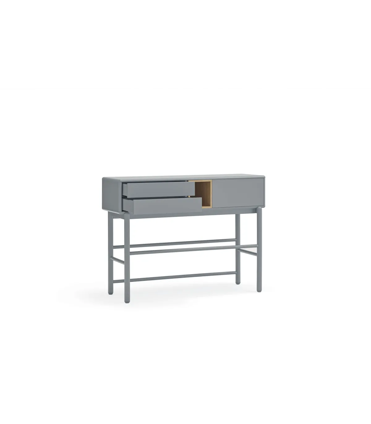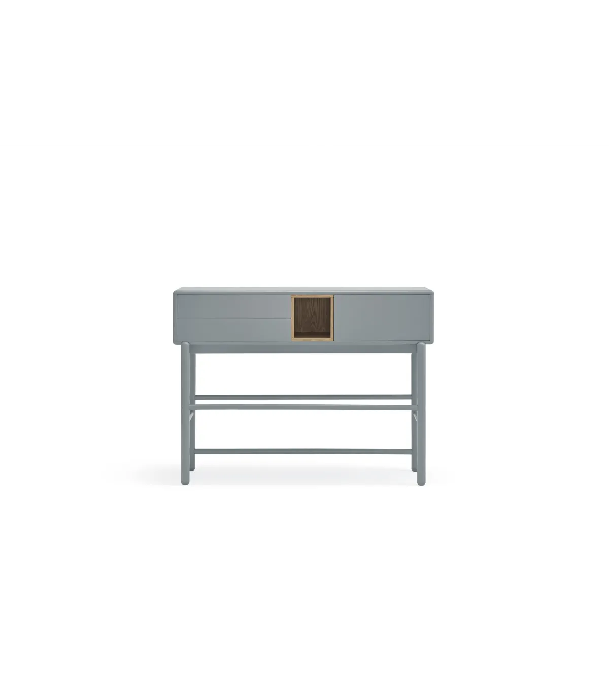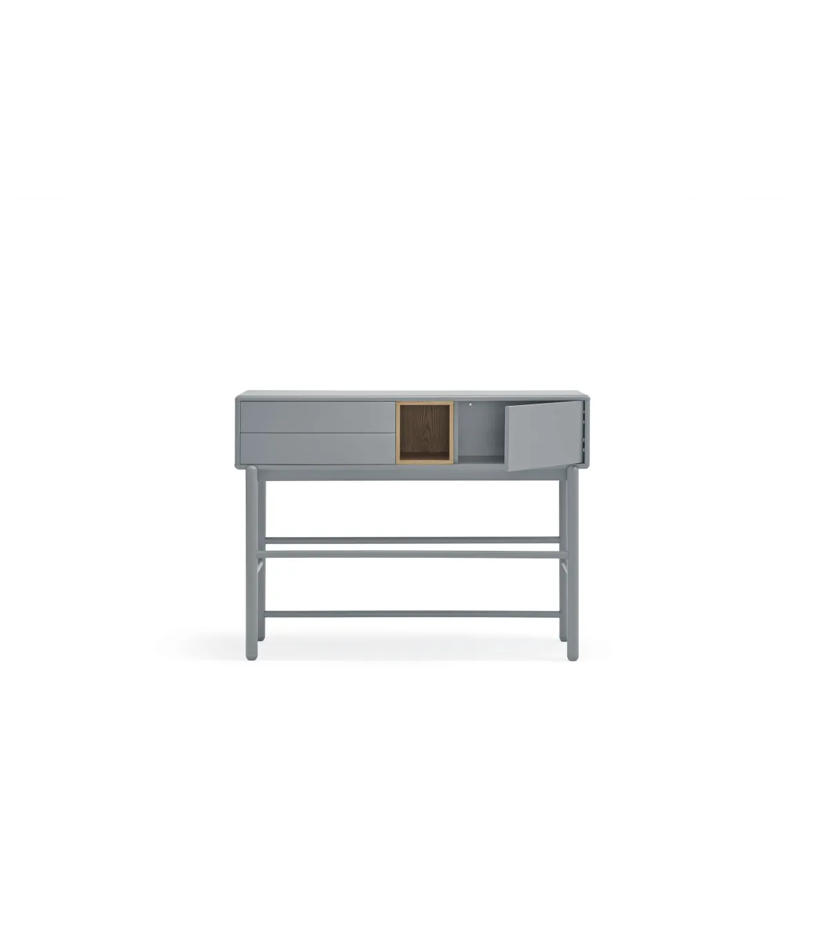 Consola Corvo, está fabricado en DM lacado con acabado en color gris perla. Esta compuesto por 1 puerta, 1 hueco y 2 cajones. Esta consola se apoya sobre 4 patas con acabado en el mismo color del mueble. Gracias a su diseño minimalista combinará a la perfección con cualquier ambiente.
