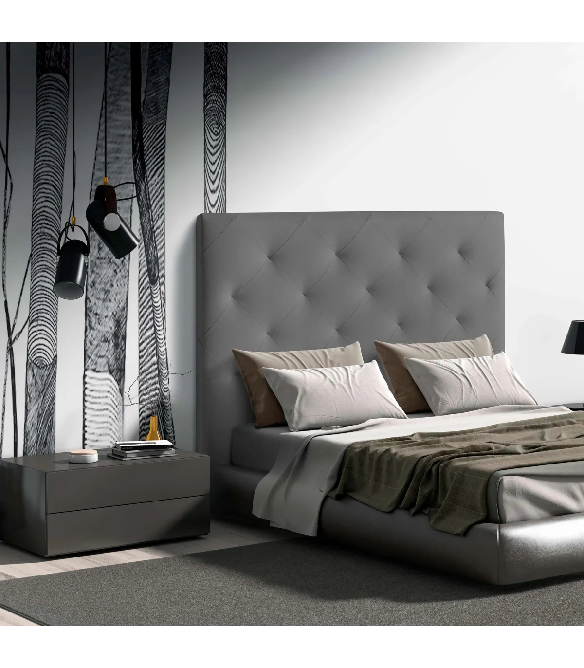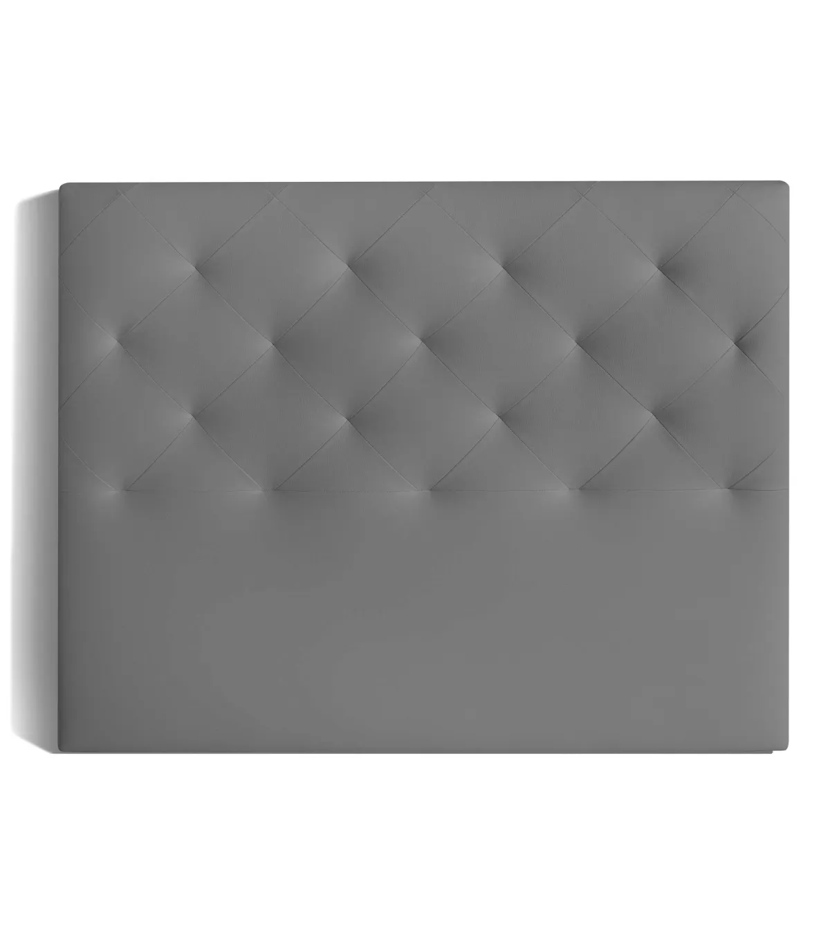 Cabecero horizontal tapizado, con un acabado de algodón guateado en su interior con marco de madera de pino rematado a rombos en la parte superior y liso en la inferior con capitoné y pespuntes. Acabado en ecopiel en color gris de tacto suave.