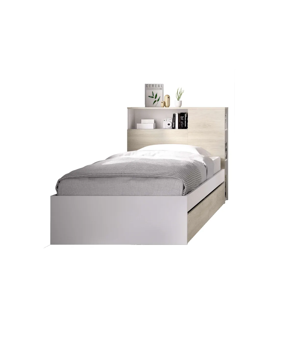 Cama juvenil con dos cajones inferiores para colchón de 90 x 190cm, esta cama es perfecta para espacios pequeños. Su color natural y blanco combina fácilmente con cualquier decoración.