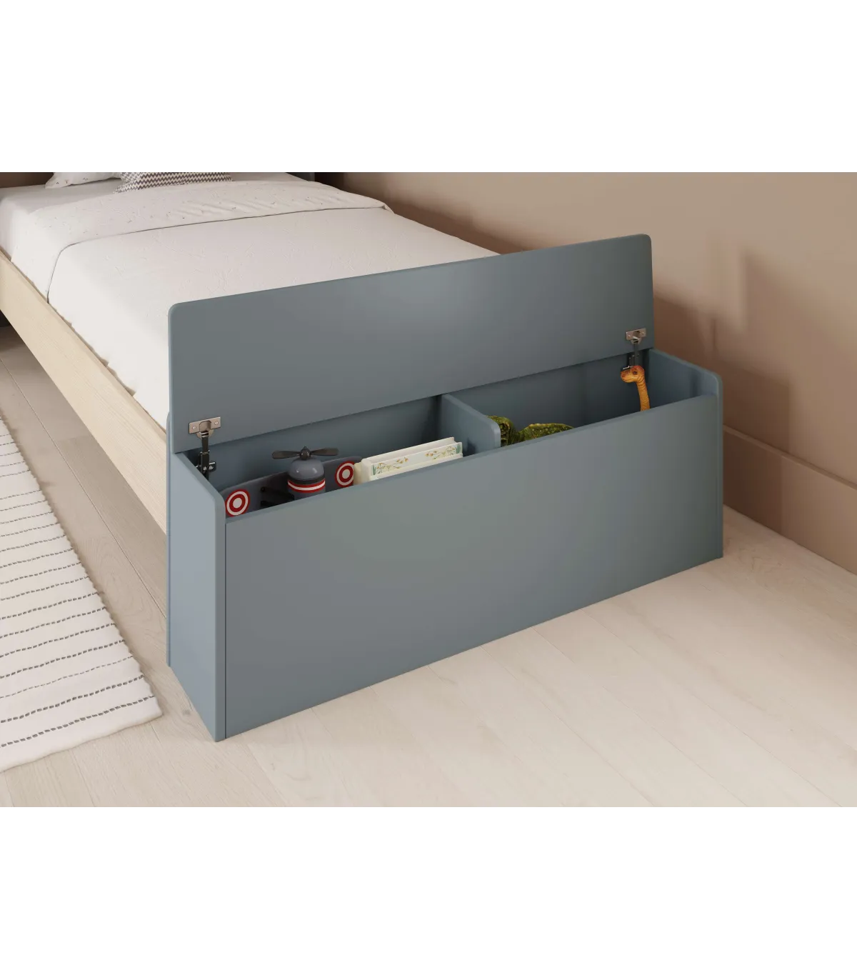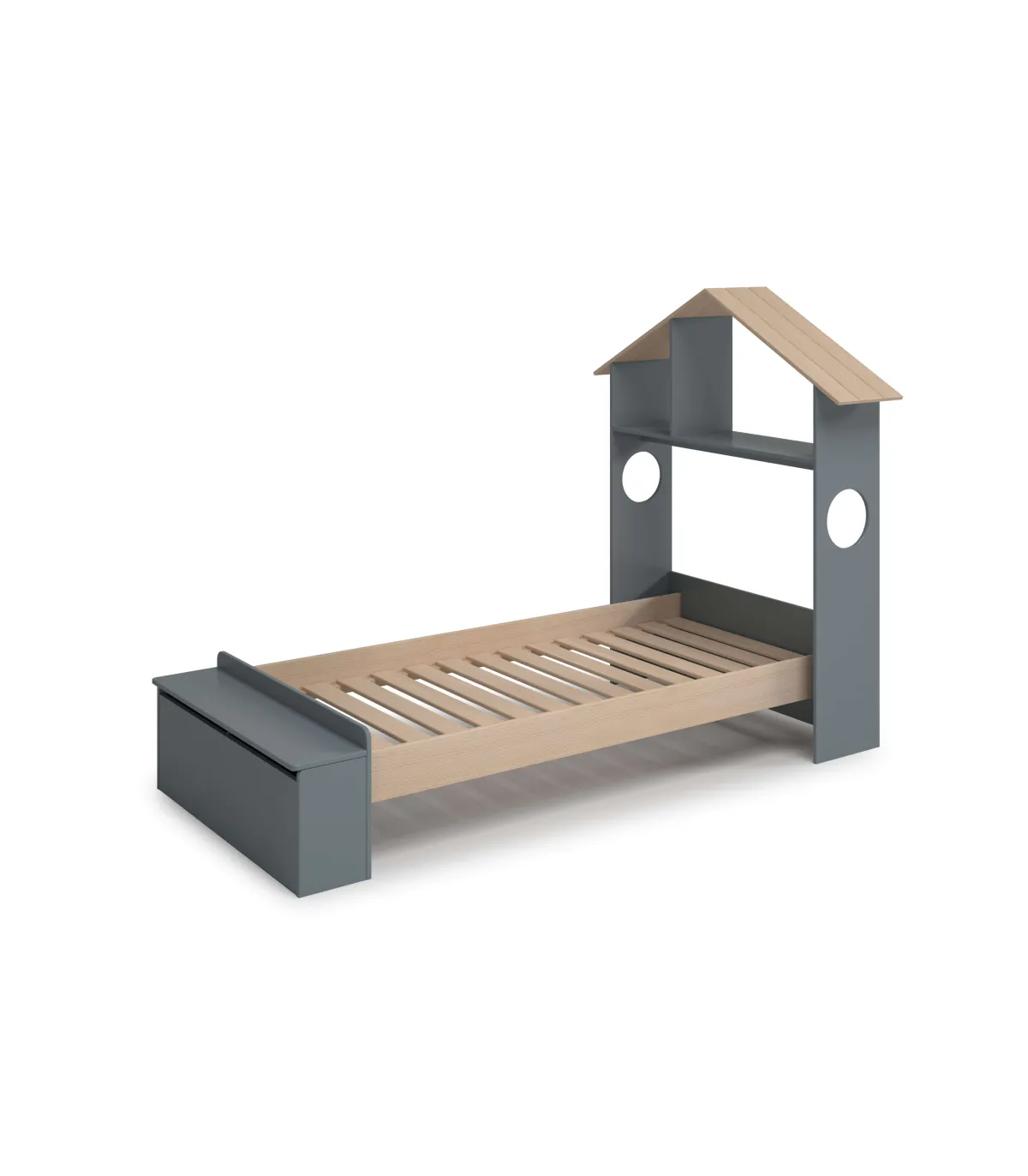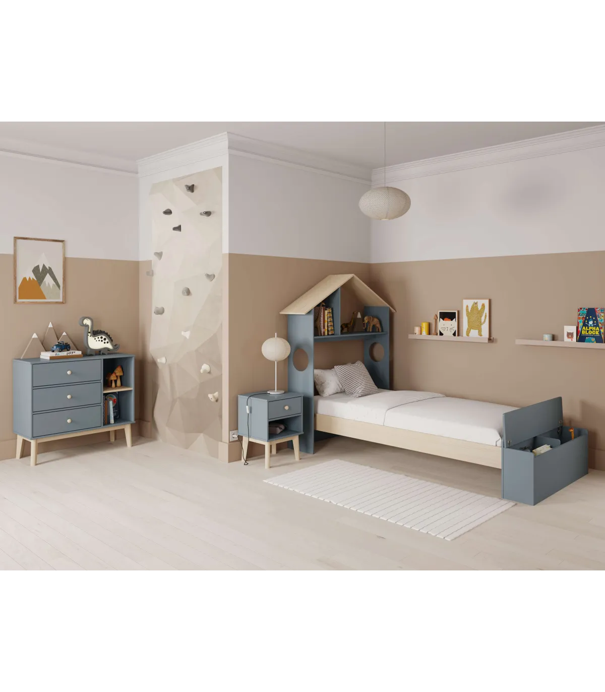La cama infantil presenta un diseño diferente y único en forma de casita, en DM/PINO tintada en tono verde kaki combinado con cera blanca que le confieren un aspecto natural.
