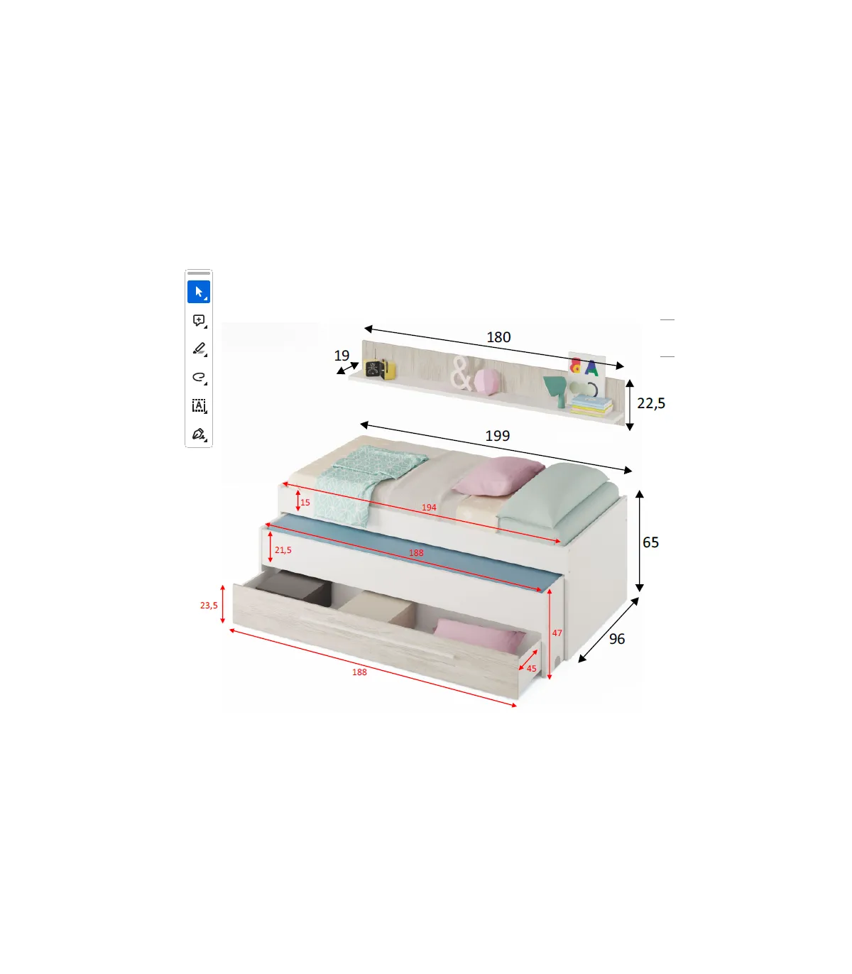 Cama superior: 65 cm (alto) x 199 cm (ancho) x 96 cm (prof.)
