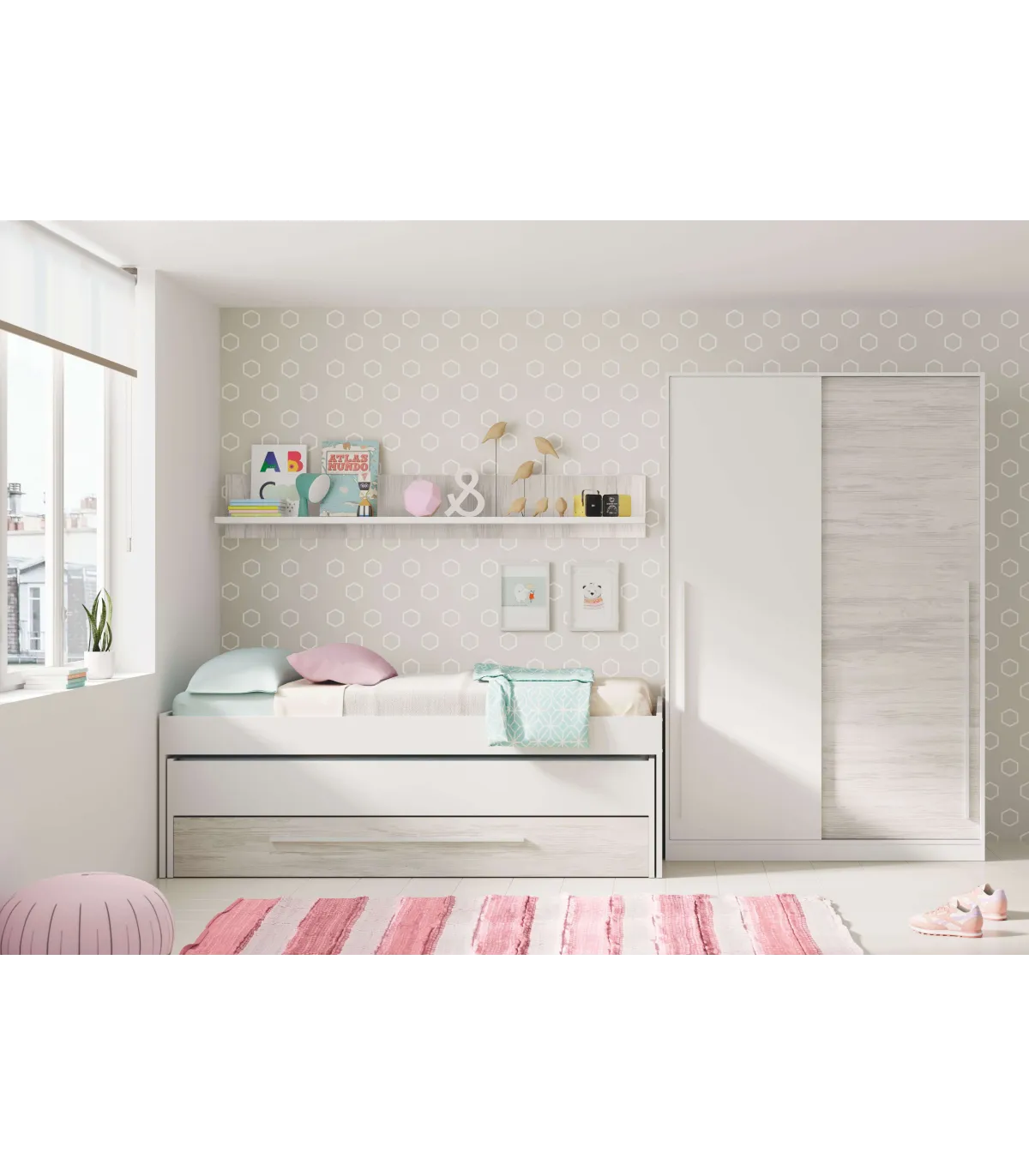 Conjunto de cama compacta nido. Incluye cajón para almacenamiento en la parte de abajo y una bonita estantería.