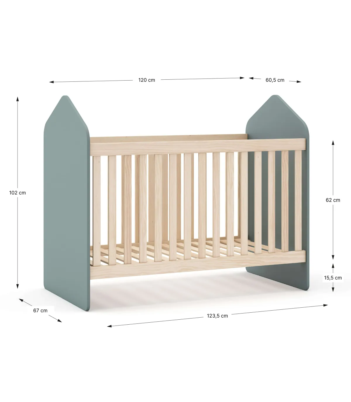 Cuna infantil Estela, diseño moderno y seguro para tu bebé · Acabado verde kaki/cera blanca · Medidas 102x66.5x123.8 cm.