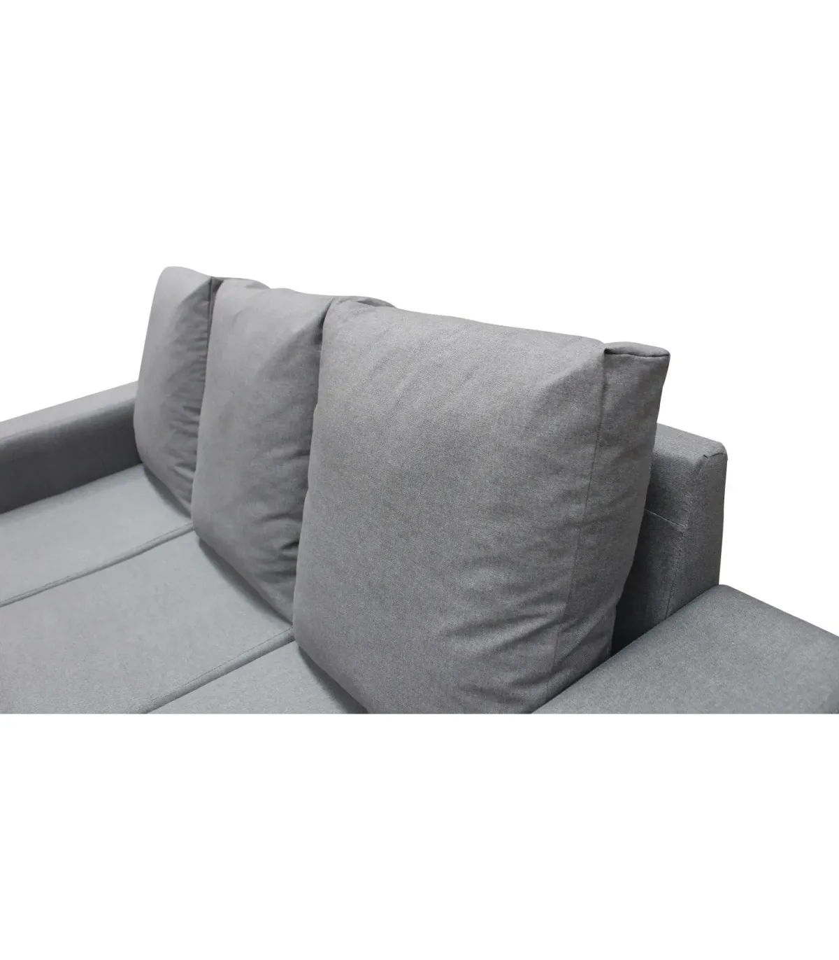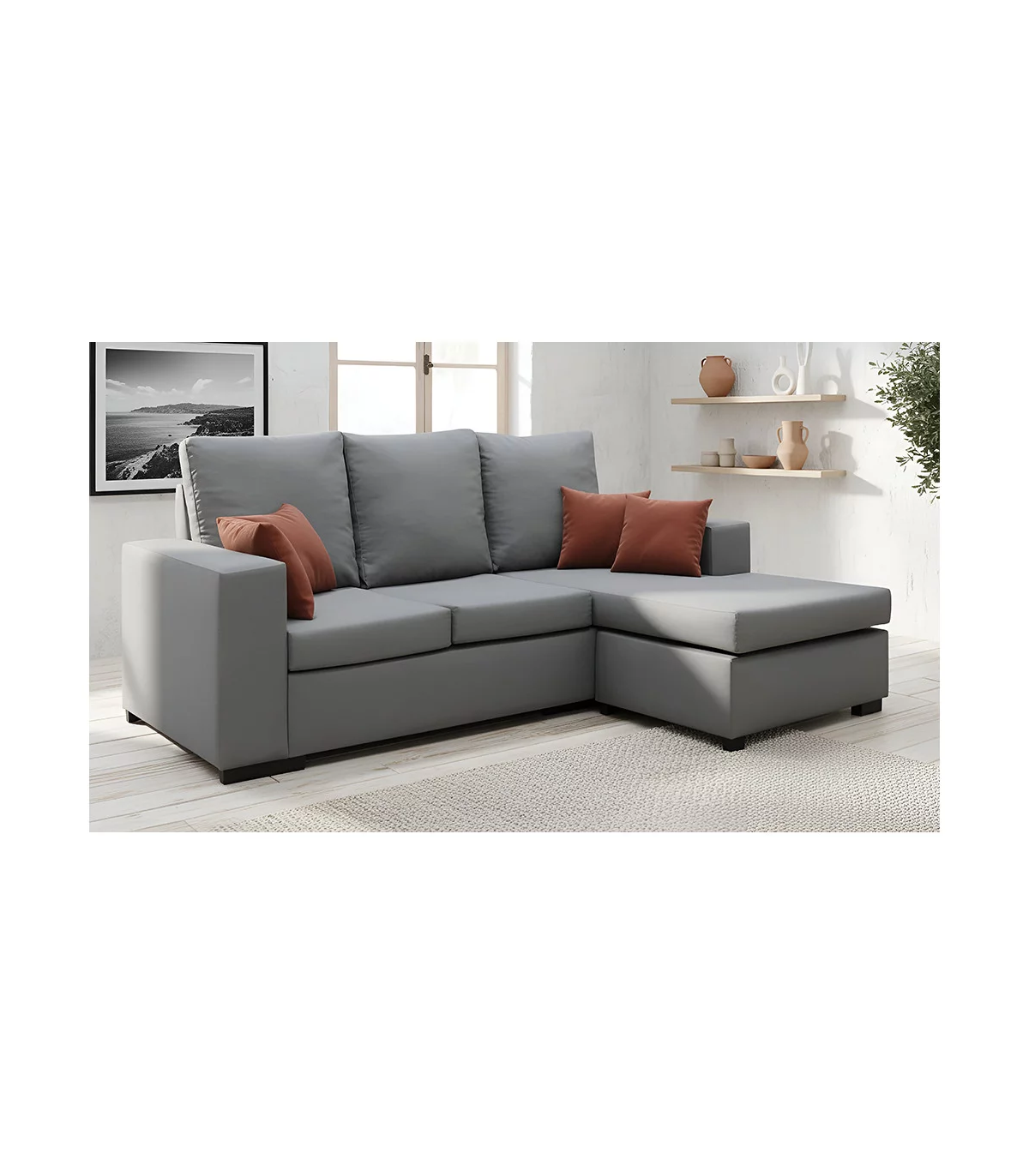 Las tres características principales de este modelo de sofá chaiselongue son su económico precio, sus medidas reducidas y su tejido repelente a los líquidos.