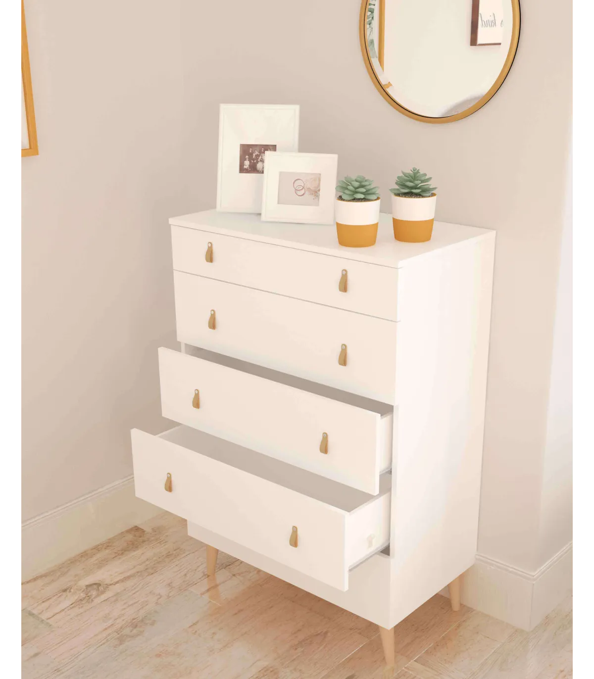 Este espectacular mueble de almacenamiento cuenta con un diseño moderno y elegante. Su acabado en blanco poro es fácil de mantener y proporciona una apariencia sofisticada. Sus patas de color roble le dan un aspecto cálido y natural. Este sifonier con 5 cajones, ofrece espacio adicional para guardar ropa, toallas y otros objetos pequeños. Además, sus tiradores de estilo nórdico le dan un toque original. En resumen, este sifonier es una opción atractiva y práctica para cualquier habitación.