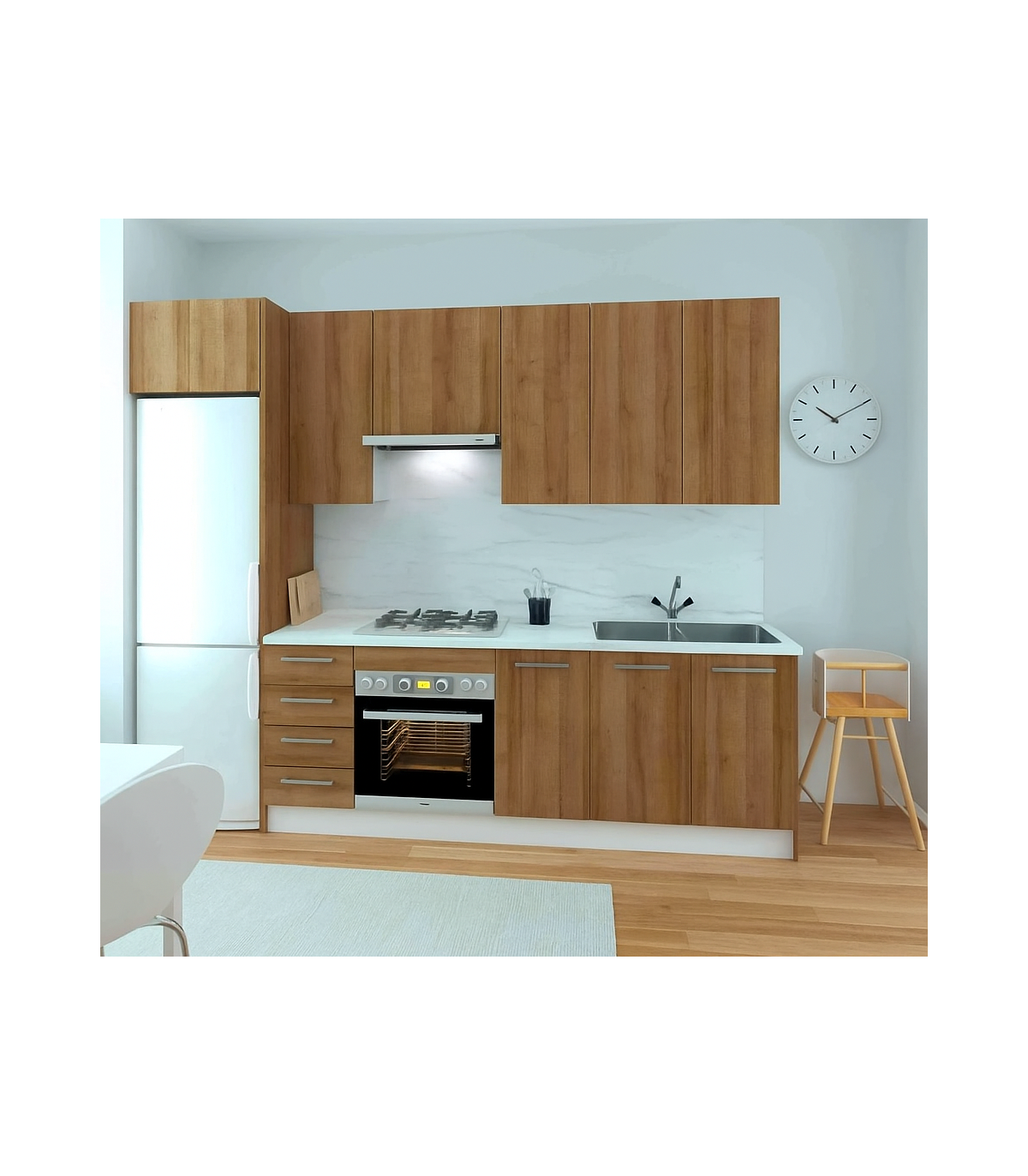 Cocina en kit en roble compuesta por 5 módulos altos, 4 bajos y 3 costados decorativos con un ancho total de 285cm. Encimera y zócalo incluidos.