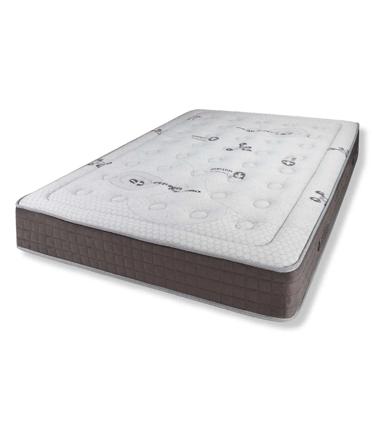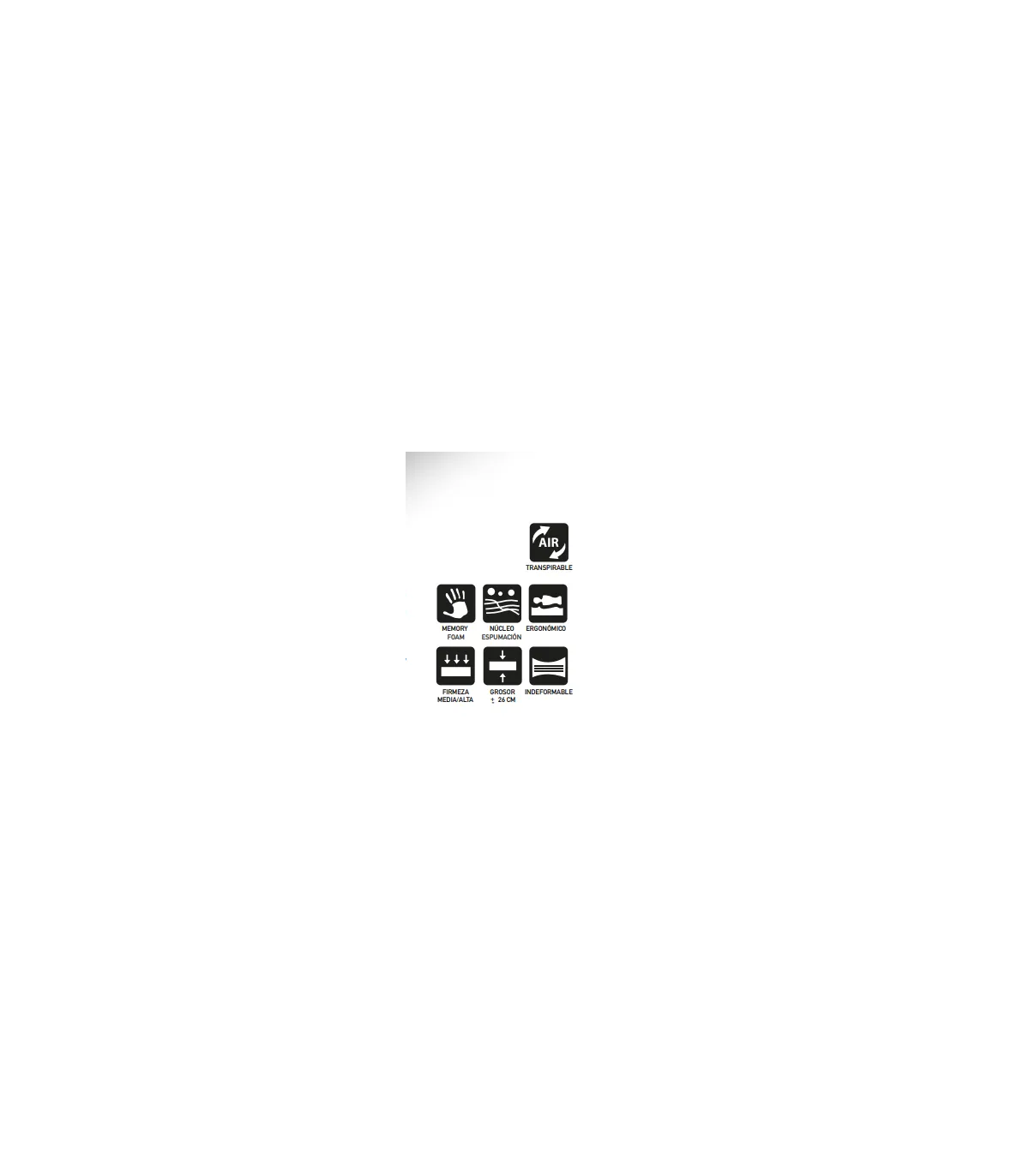 Colchón de núcleo HR D/23-25 kg/m3 . Acolchado etter súper-soft alta densidad más fibras thermo que ayuda a la transpiración. Perfecto para la espalda con su efecto memory foam se adapta al contorno del cuerpo en función del peso no quedando ninguna parte sin apoyo y volviendo a su postura natural de forma lenta y suave. Sistema de tapa a tapa tejido strech farma cabono suave en cara superior y cara inferior en tejido rejilla 3D AIR blanco, proporciona una máxima transpiración permitiendo la circulación del aire.
