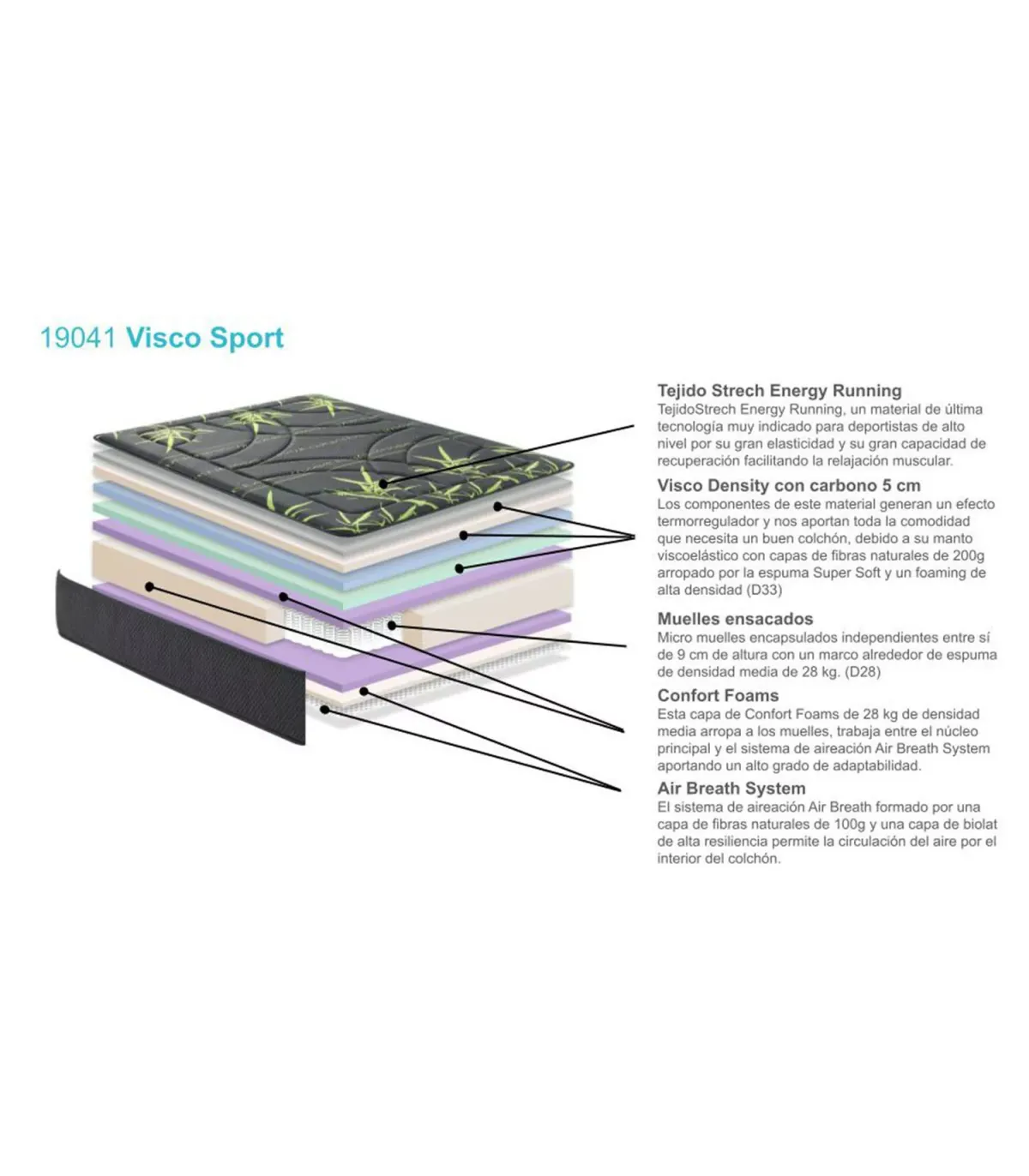 Colchón viscoelástico de 150x190 Visco Sport con muelles ensacados, un modelo muy apreciado por deportistas y por personas que saben valorar las cualidades de un buen descanso. Altura 28 cm. (Aprox).