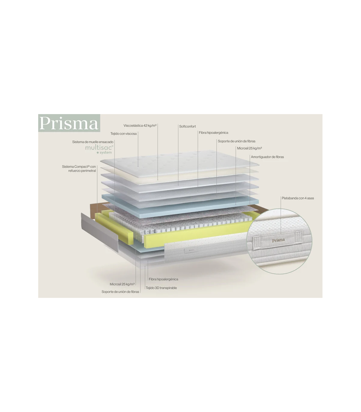 El colchón Prisma de Sonpura cuenta en su núcleo con el sistema de muelles ensacados Multisac System, con 500 muelles en medida de 150x190. Entre sus acolchados destacan capas de Viscoelástica, Softconfort y Microsil, todo combinado ofrece un descanso firme y de sensación confortable en la tumbada. Disponible en grosor de 29 cm.