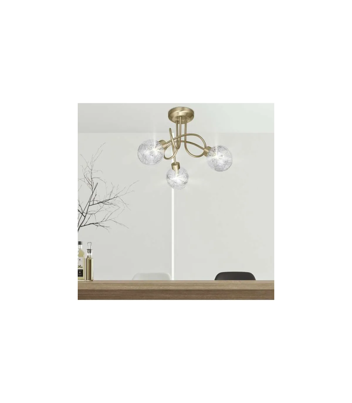 lámpara Menta moderna, tres puntos de luz orientables con tulipas de cristal decoradas por hilos metálicos y estructura de metal disponible en cuero. Su diseño minimalista y actual es ideal para iluminar la mesa de tu comedor, salón....