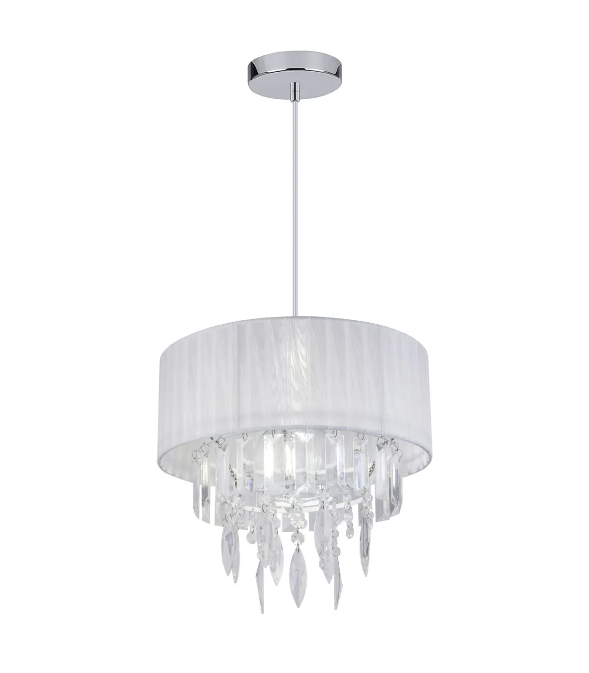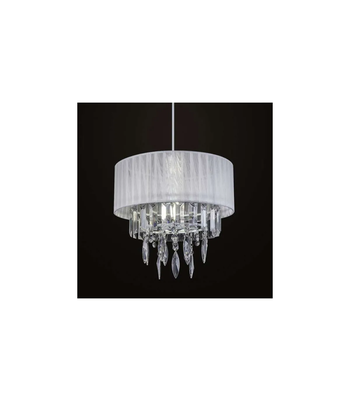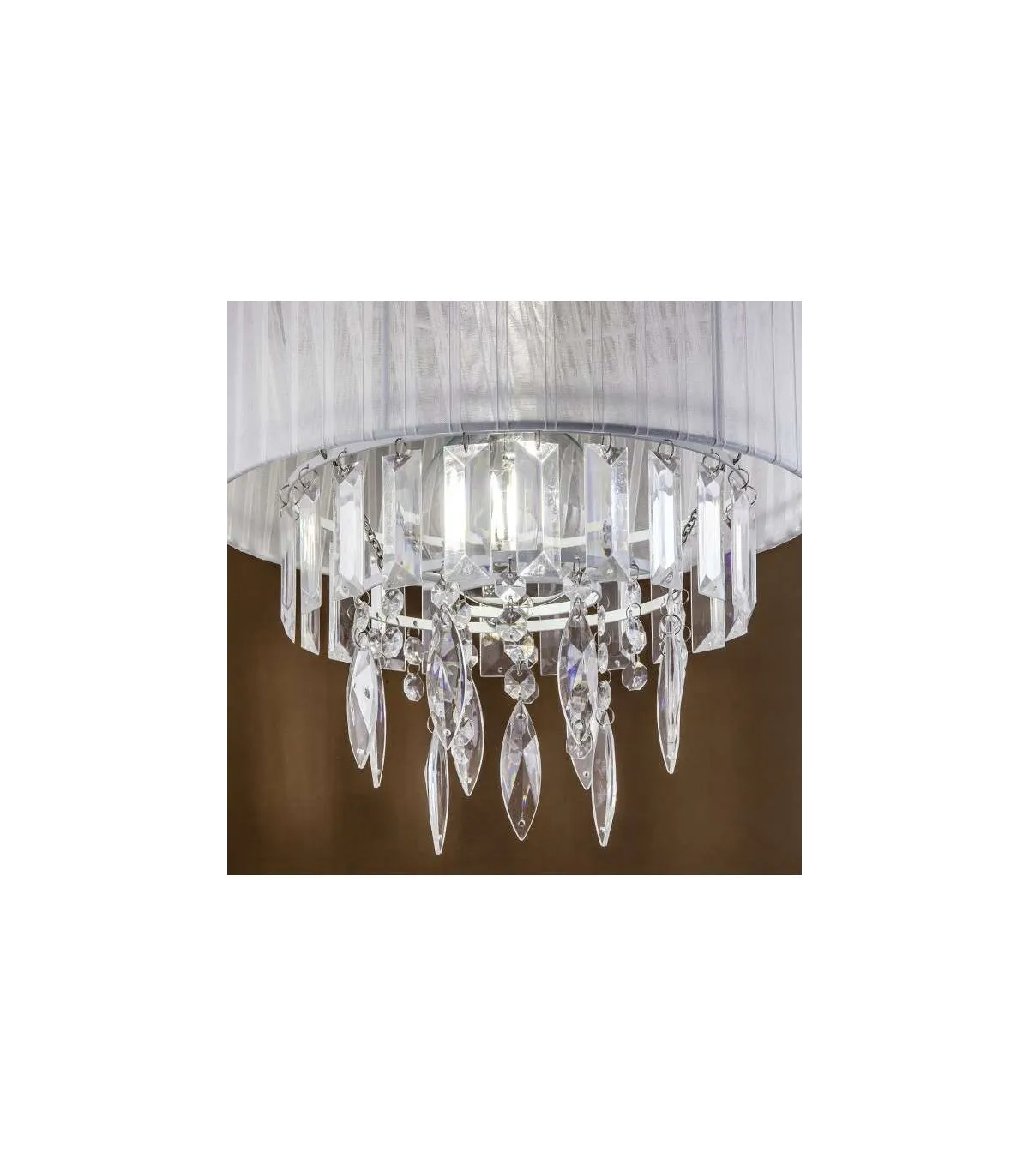 Lámpara de techo combina una pantalla circular de tela traslucida con elementos decorativos en suspensión en dos niveles. La tela de la pantalla es de color blanco que junto a la estructura de acabado cromado le aporta un aire moderno al estilo clásico de esta lámpara ideal para el dormitorio.