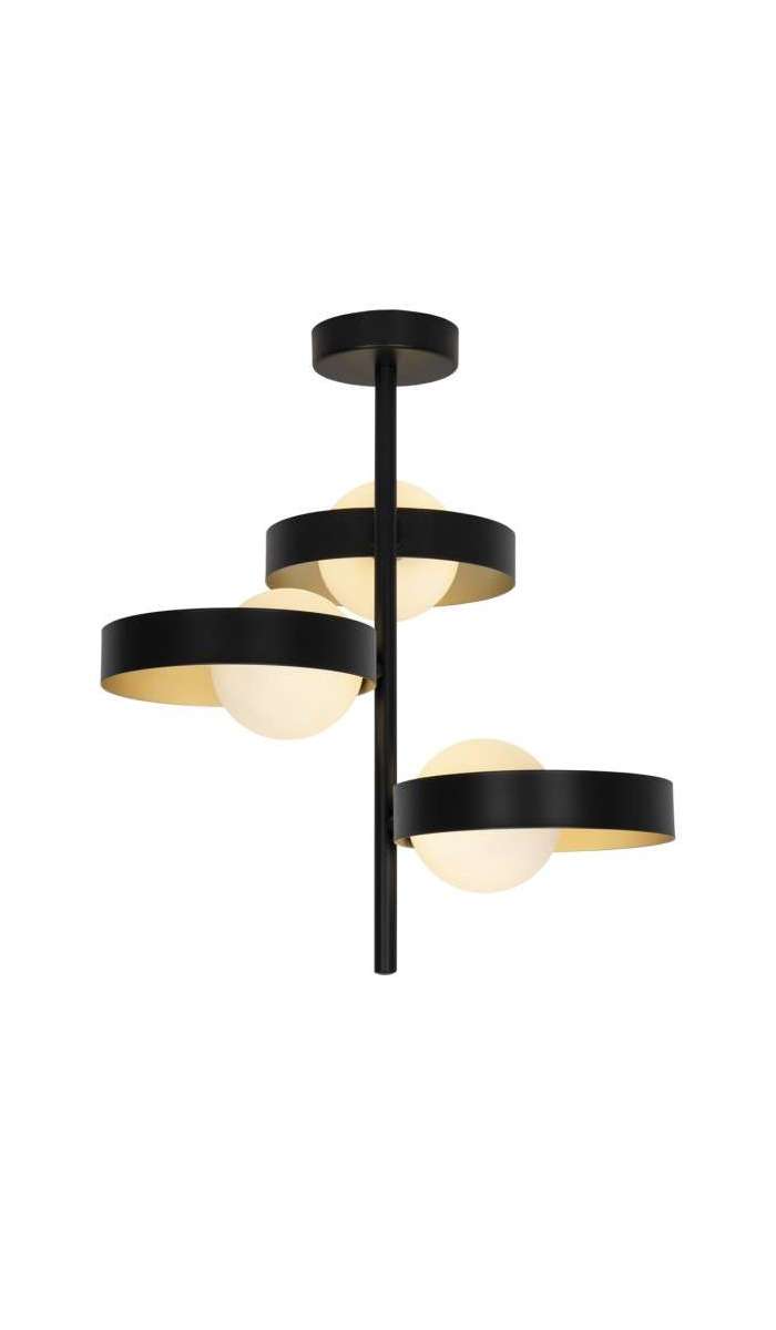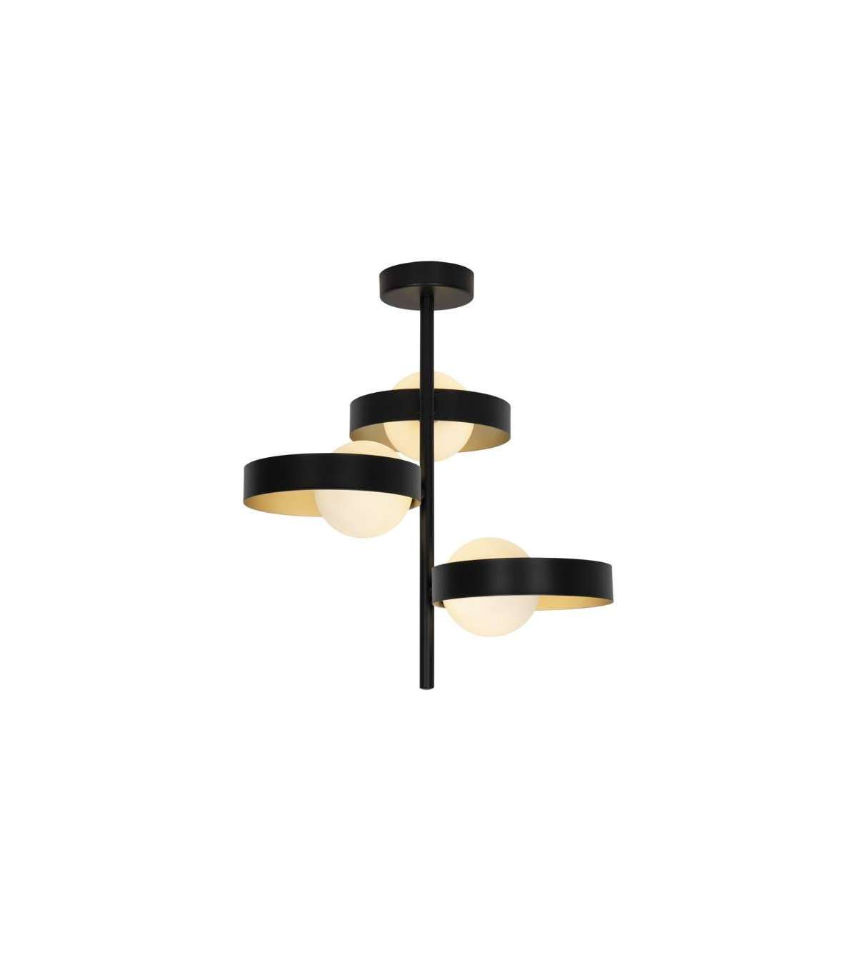 Colgante a techo 3 luces de la Colección ARIANNA. Fabricado en metal acabado exterior negro e interior decorado en color oro mate. Incorpora tulipa en cristal opal, completando esta preciosa luminaria. Usa bombillas G9, 3 x G9 33W Max. . BOMBILLAS NO INCLUIDAS