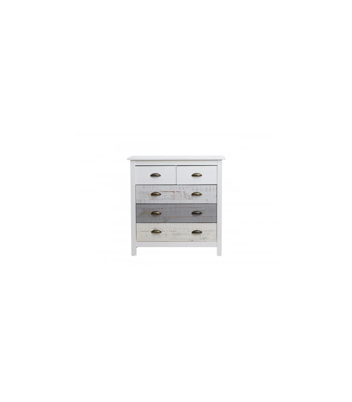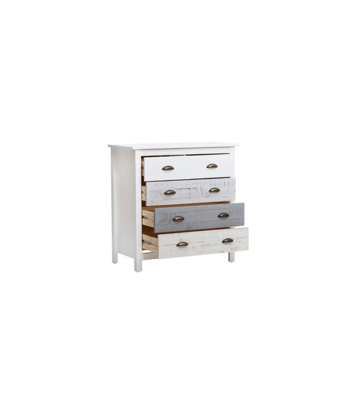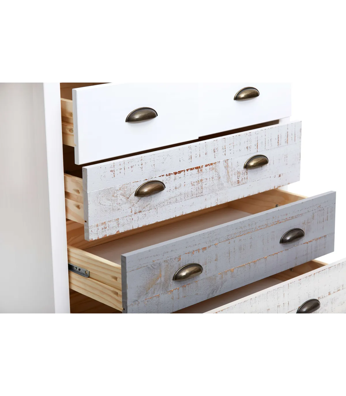 Los tres cajones grandes inferiores presentan un acabado decapado en diferentes colores, lo que añade un toque de encanto rústico y vintage al mueble. Estos cajones se deslizan suavemente gracias a las guías metálicas, facilitando el acceso y la organización de tus pertenencias.
