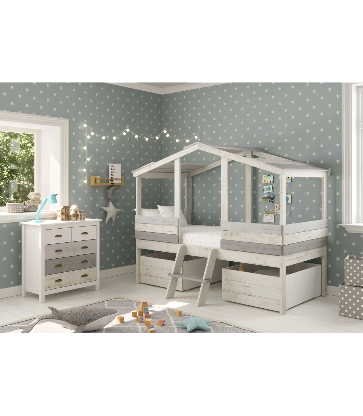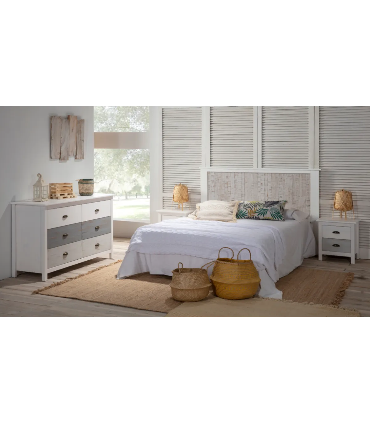 La cómoda es una pieza de mueble elegante y funcional, realizada en madera de pino de alta calidad. Su estructura y los dos cajones superiores están lacados en un hermoso color blanco, lo que le brinda un aspecto fresco y luminoso.