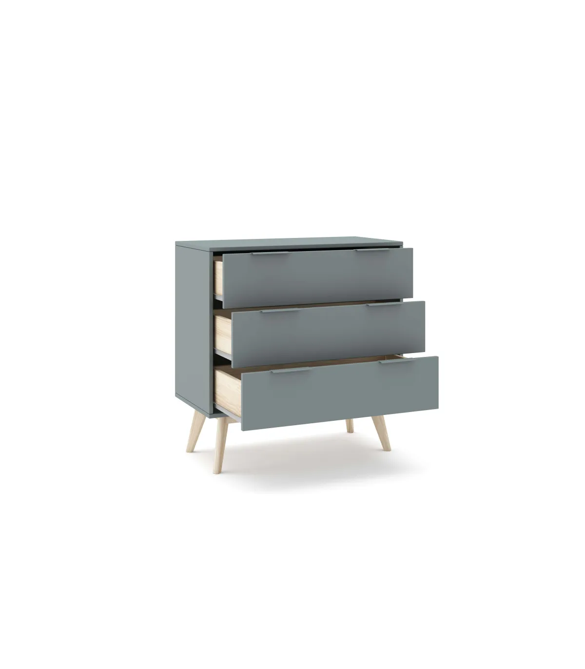 La cómoda es un mueble de almacenamiento con tres cajones, ideal para organizar y guardar diferentes tipos de objetos de manera práctica y ordenada. Está fabricada con una combinación de madera de pino y dm, lo que le otorga una estructura sólida y duradera.