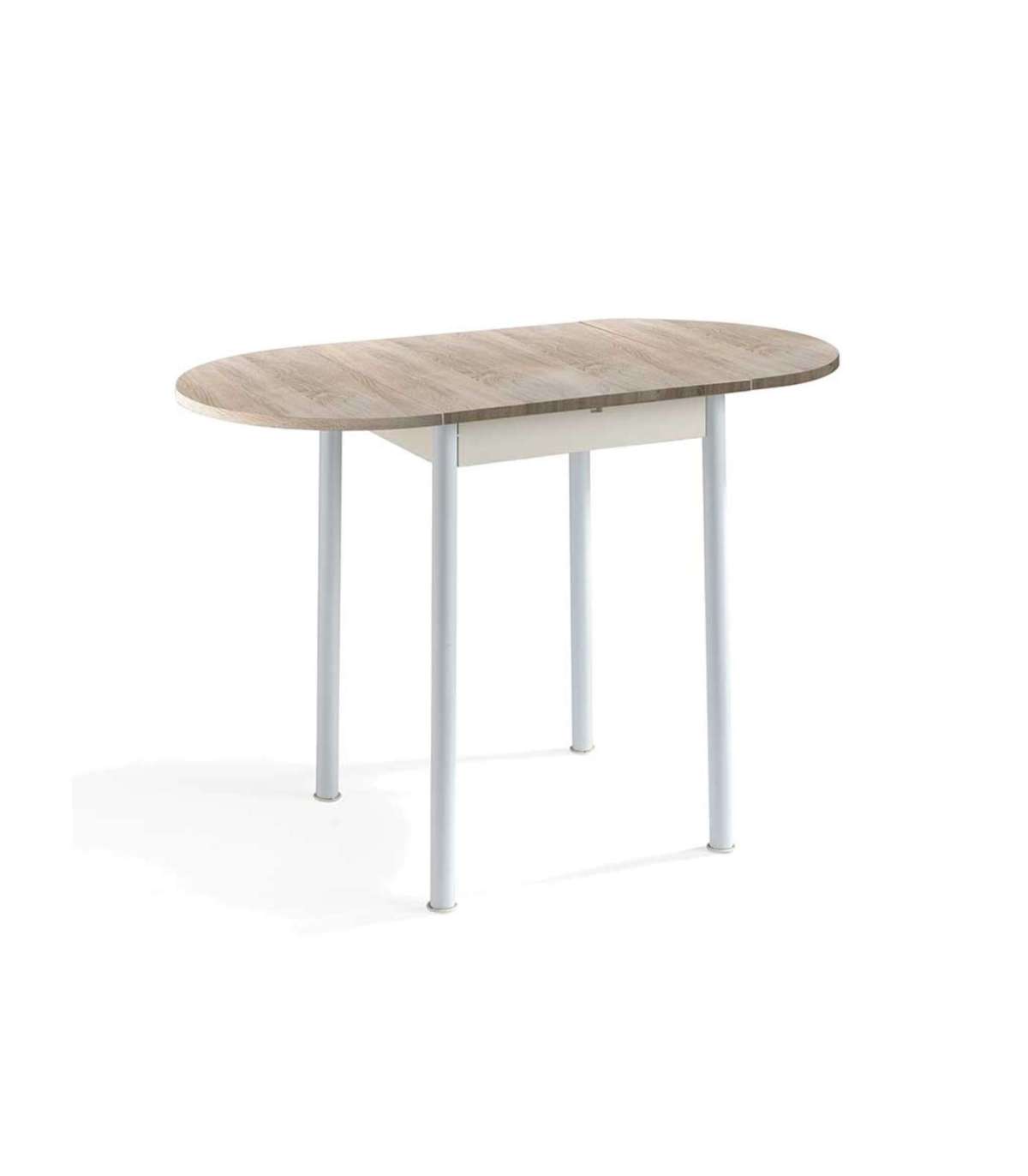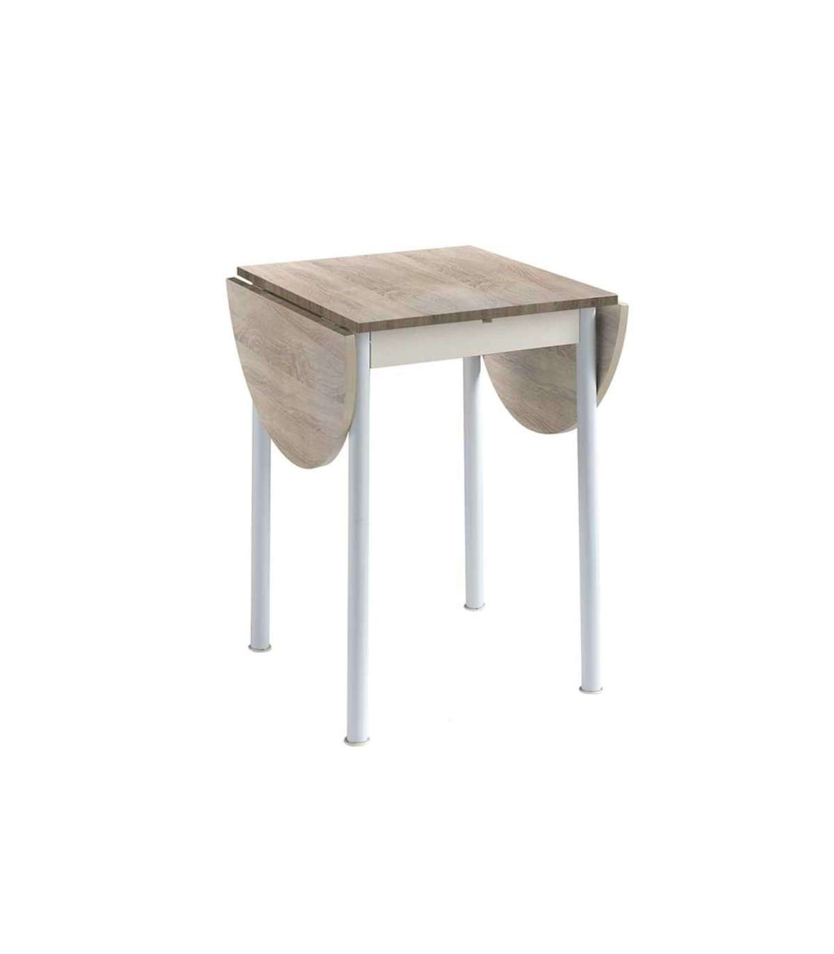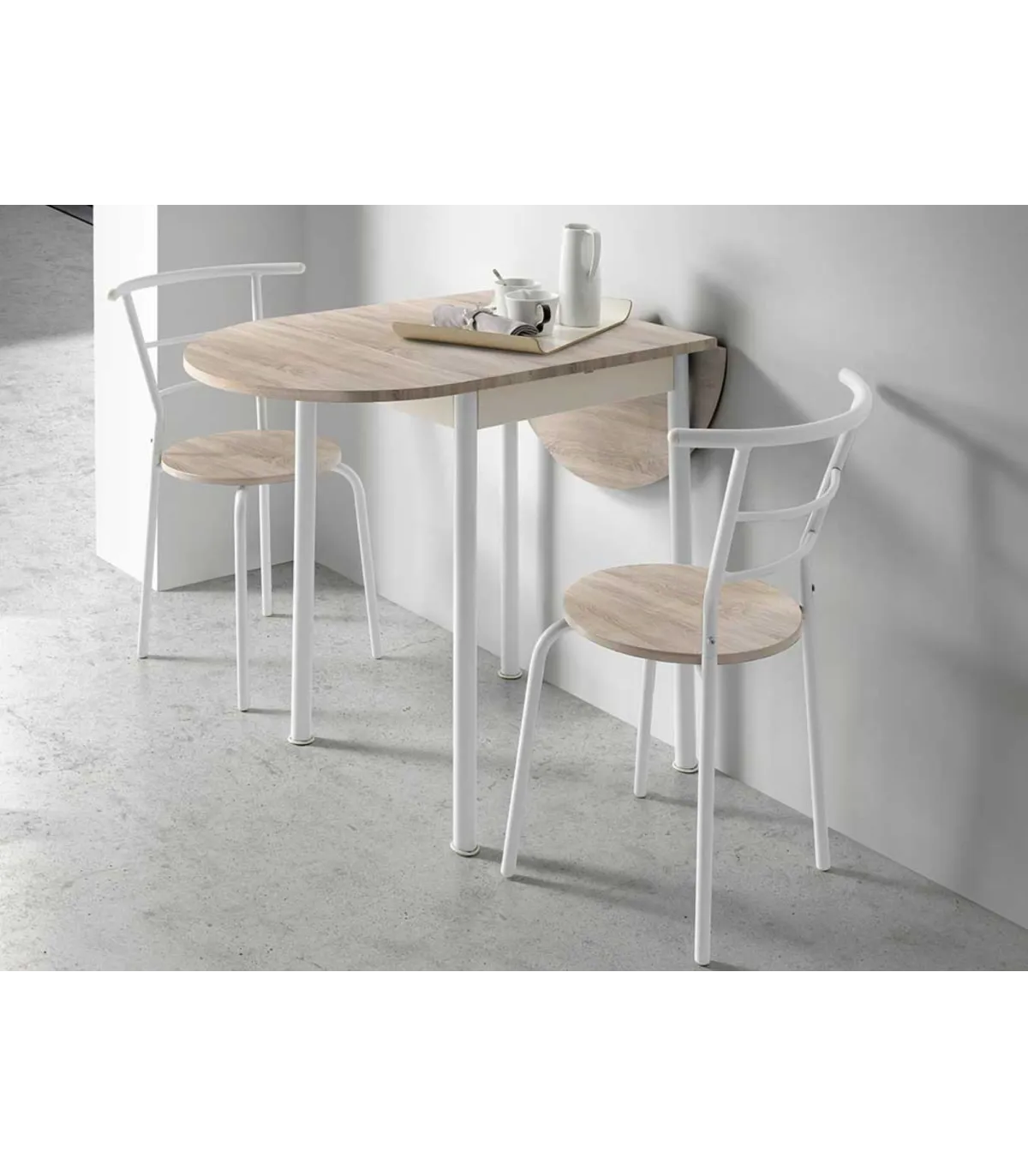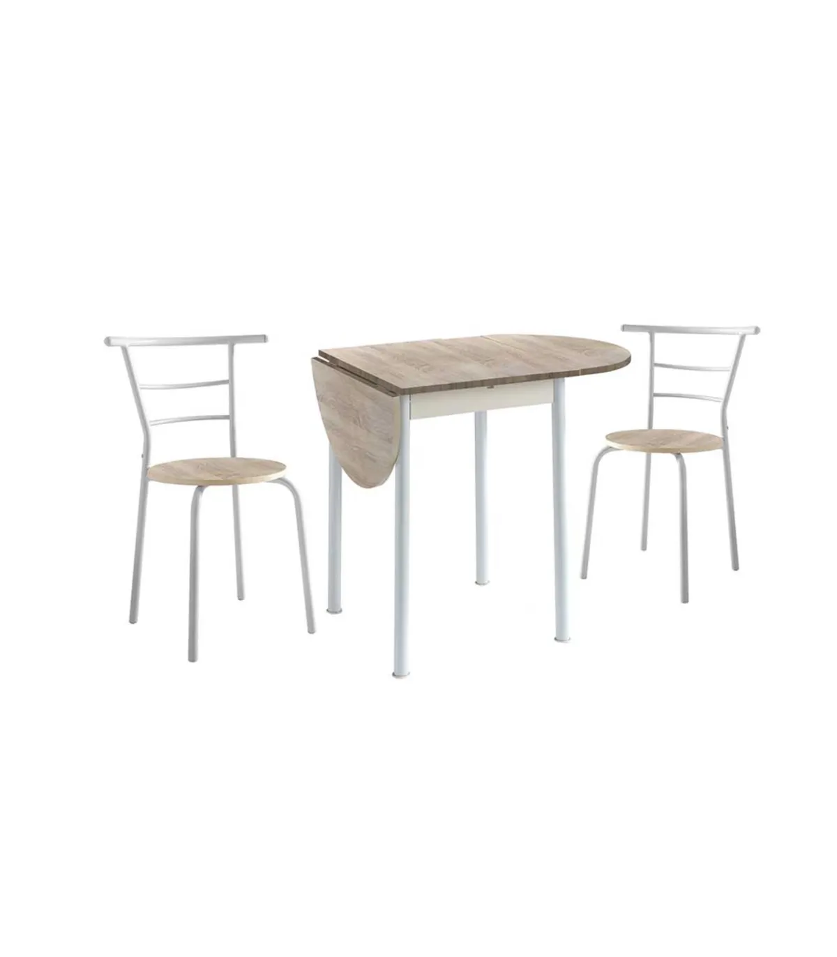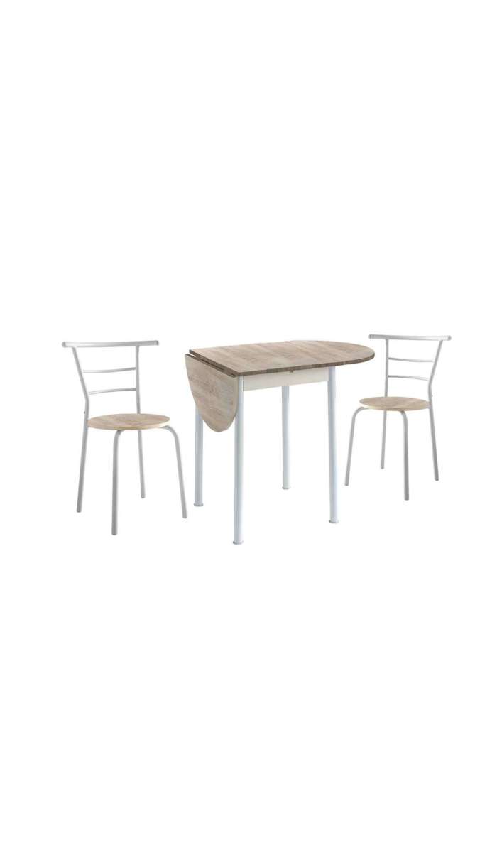 Si buscas un Conjunto de Cocina compuesto por una mesa extensible y además se complete con dos sillas para desayunar o comer en la cocina este es el conjunto ideal para ti. La mesa dispone de una encimera de MDF con acabado haya y las sillas con asiento de MDF con el mismo acabado. La estructura y patas de la mesa como de las sillas son metálicas lacadas en blanco.