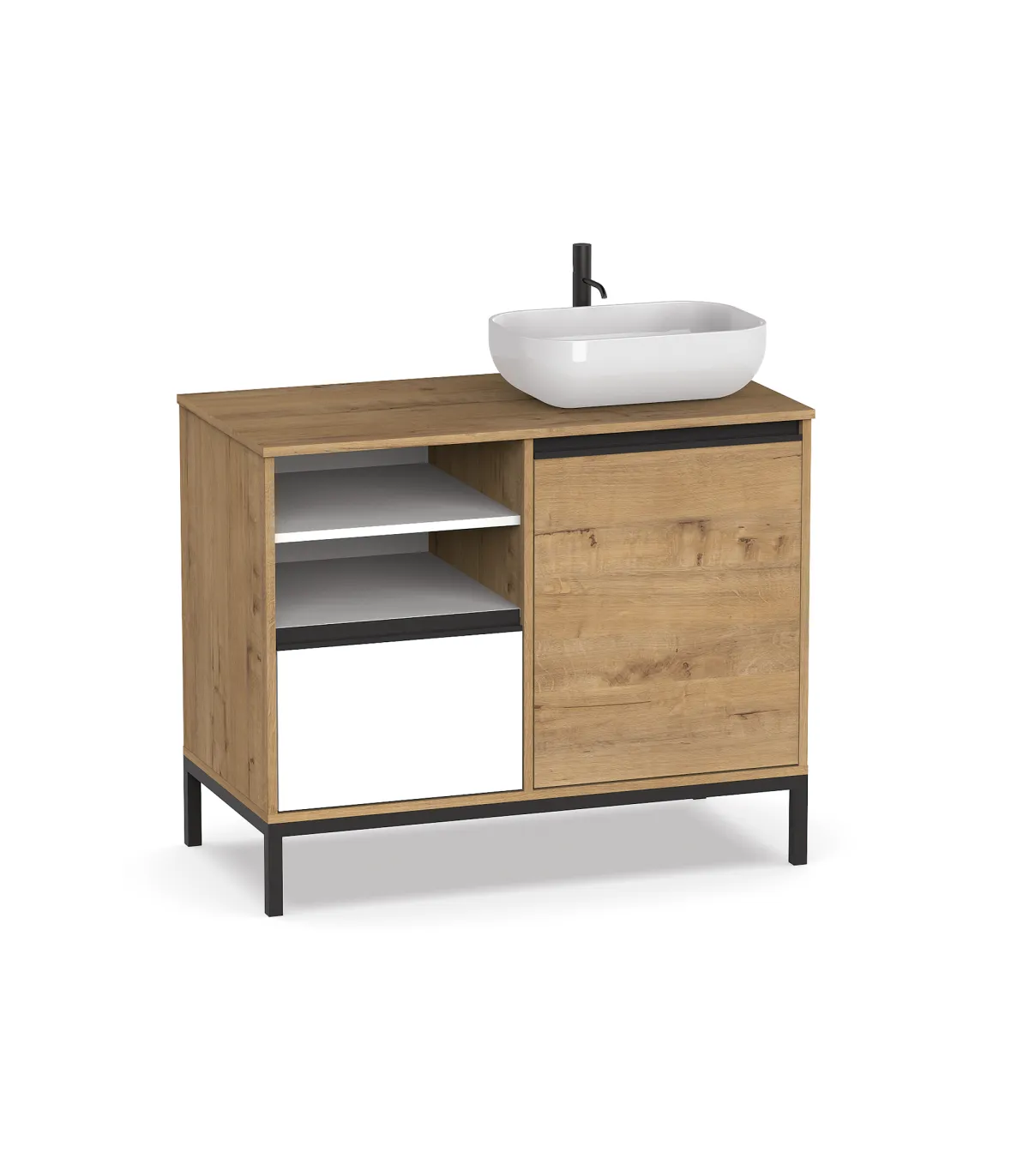 Se trata de un mueble en formato kit realizado en melanina de alta calidad, que requiere de montaje e incluye herramientas y un manual detallado. Este mueble te sorprenderá por su gran espacio interior. Dispone de un cajón, una puerta de armario con estantes internos y varias baldas abiertas, permitiendo una distribución del espacio que nos permite almacenar todos nuestros cosméticos, toallas y demás productos. El mueble está acabado casi en su totalidad en tono roble con vetas y nudos visibles. Las patas y los tiradores invisibles son los detalles que se encuentran acabados en negro, mientras que en blanco se ha realizado en frontal del cajón extraíble y la superficie de las baldas. El cajón posee unas guías metálicas que evitan el cierre brusco.