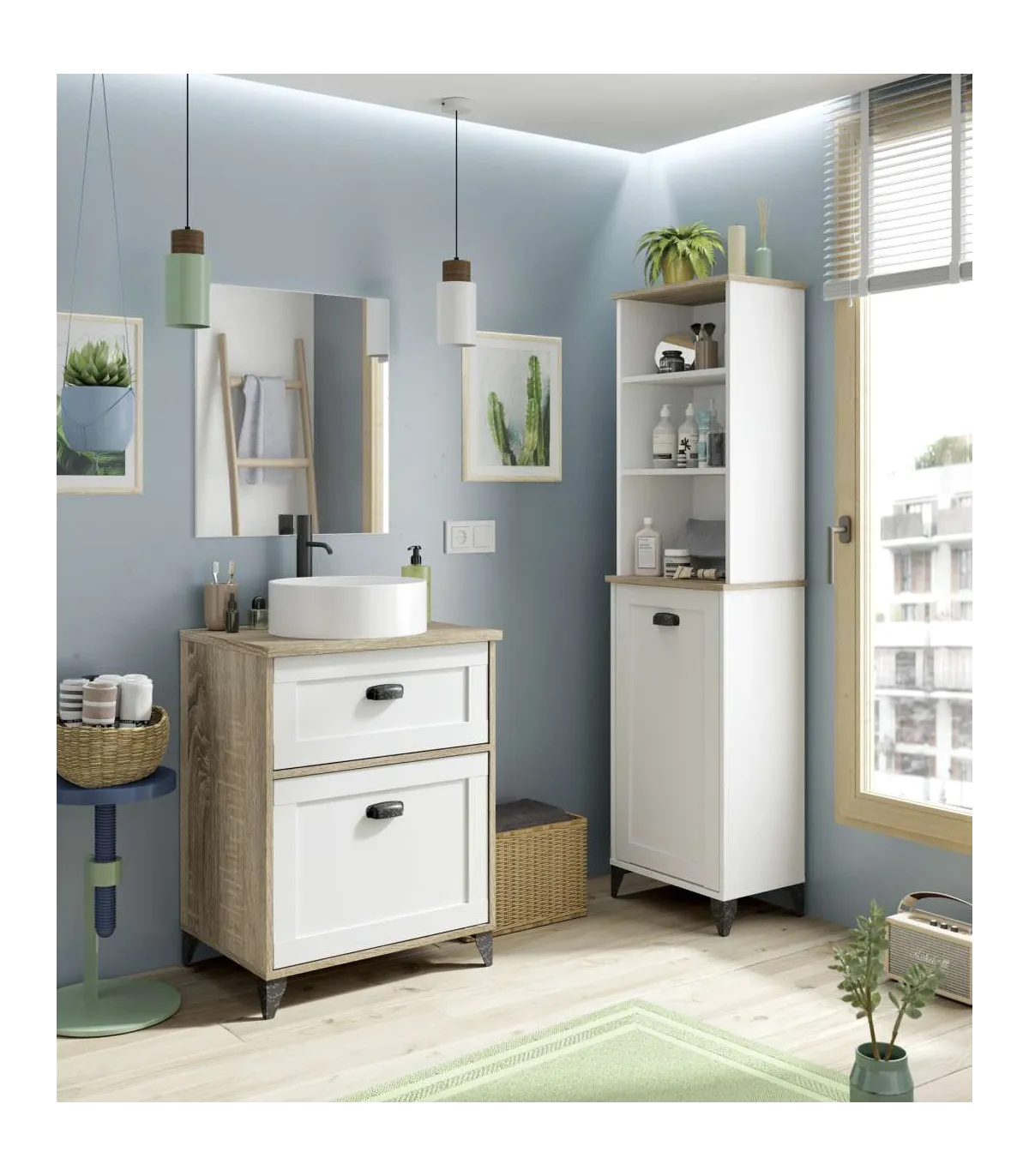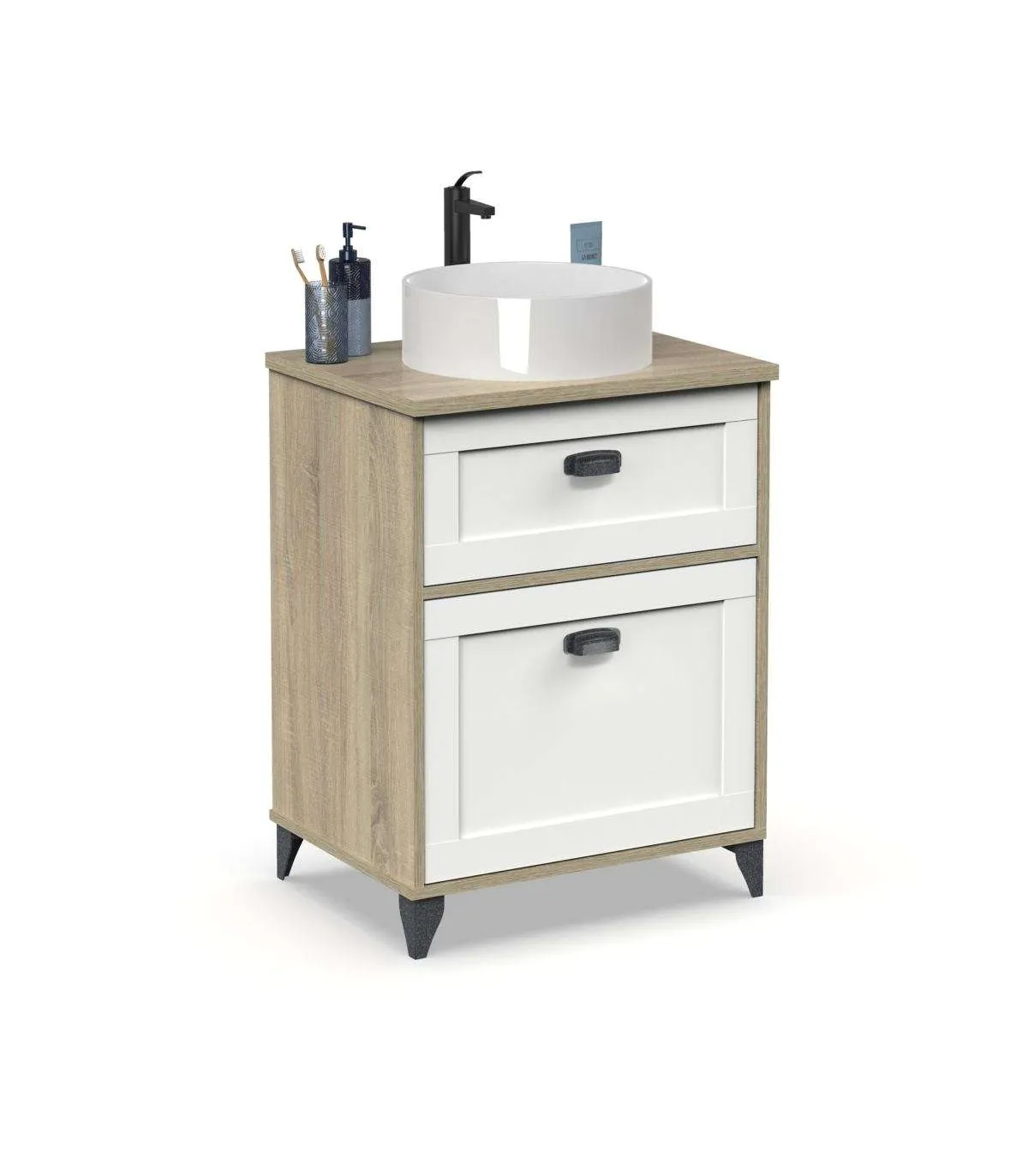 Mueble Toscana es una pieza para los enamorados del cottage. La tapa en acabado Cambrian, puerta y cajón en blanco, con curvas sutiles que se completa con unos tiradores y patas en acabado metalizado.